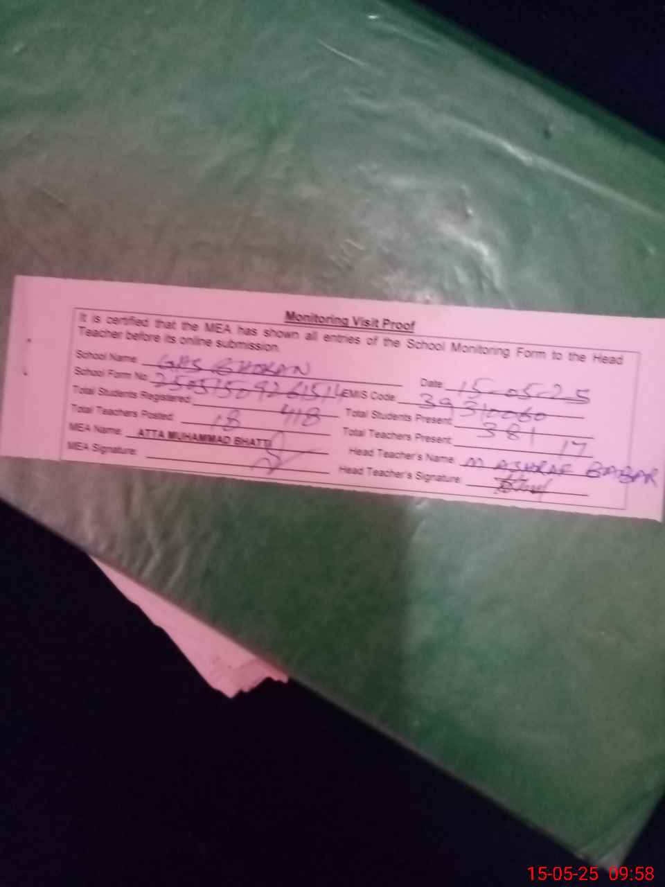 | Attendance Register | Head Teacher | MEA with School | Visit Proof |