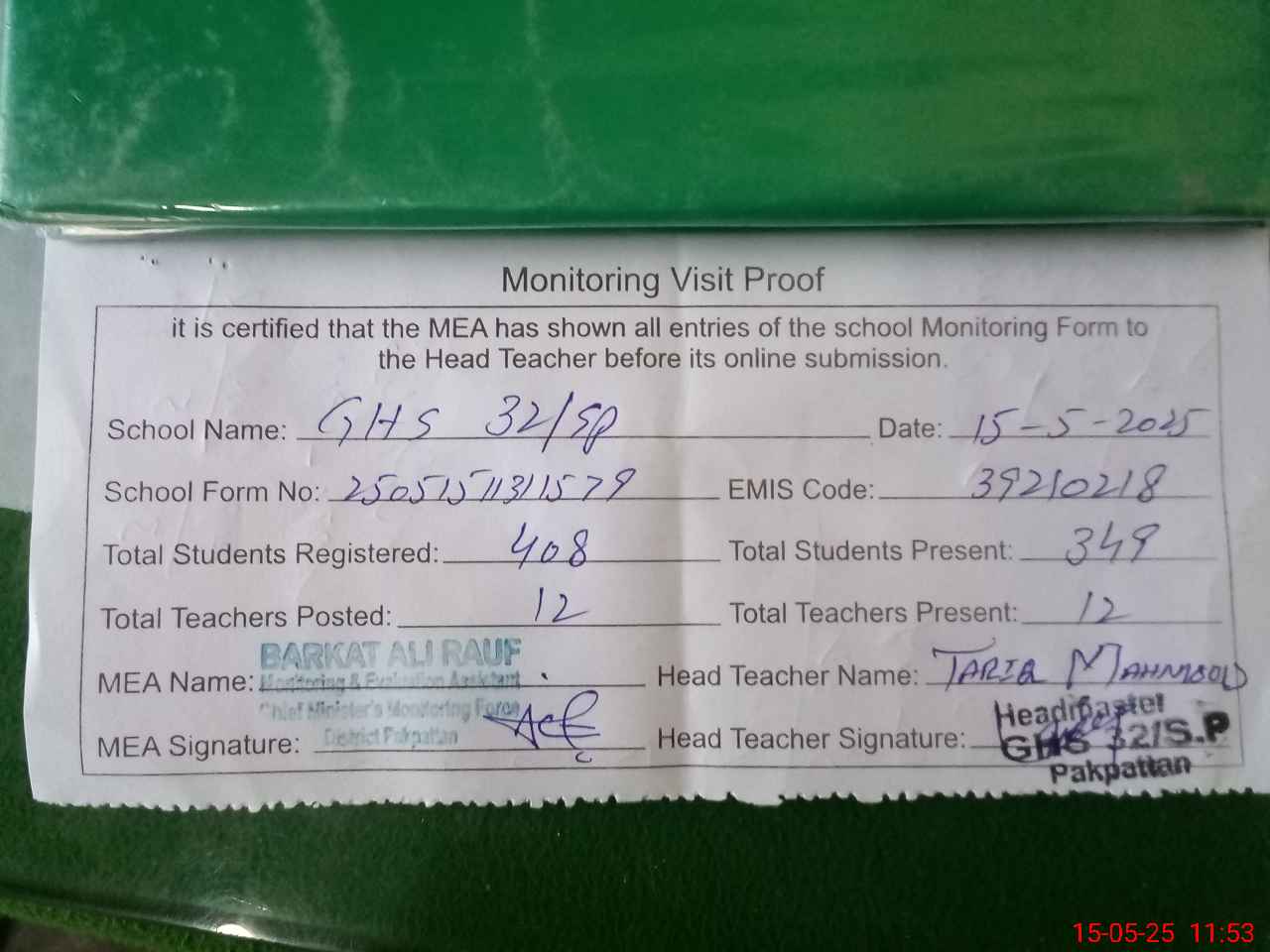 | Attendance Register | Head Teacher | MEA with School | Visit Proof |