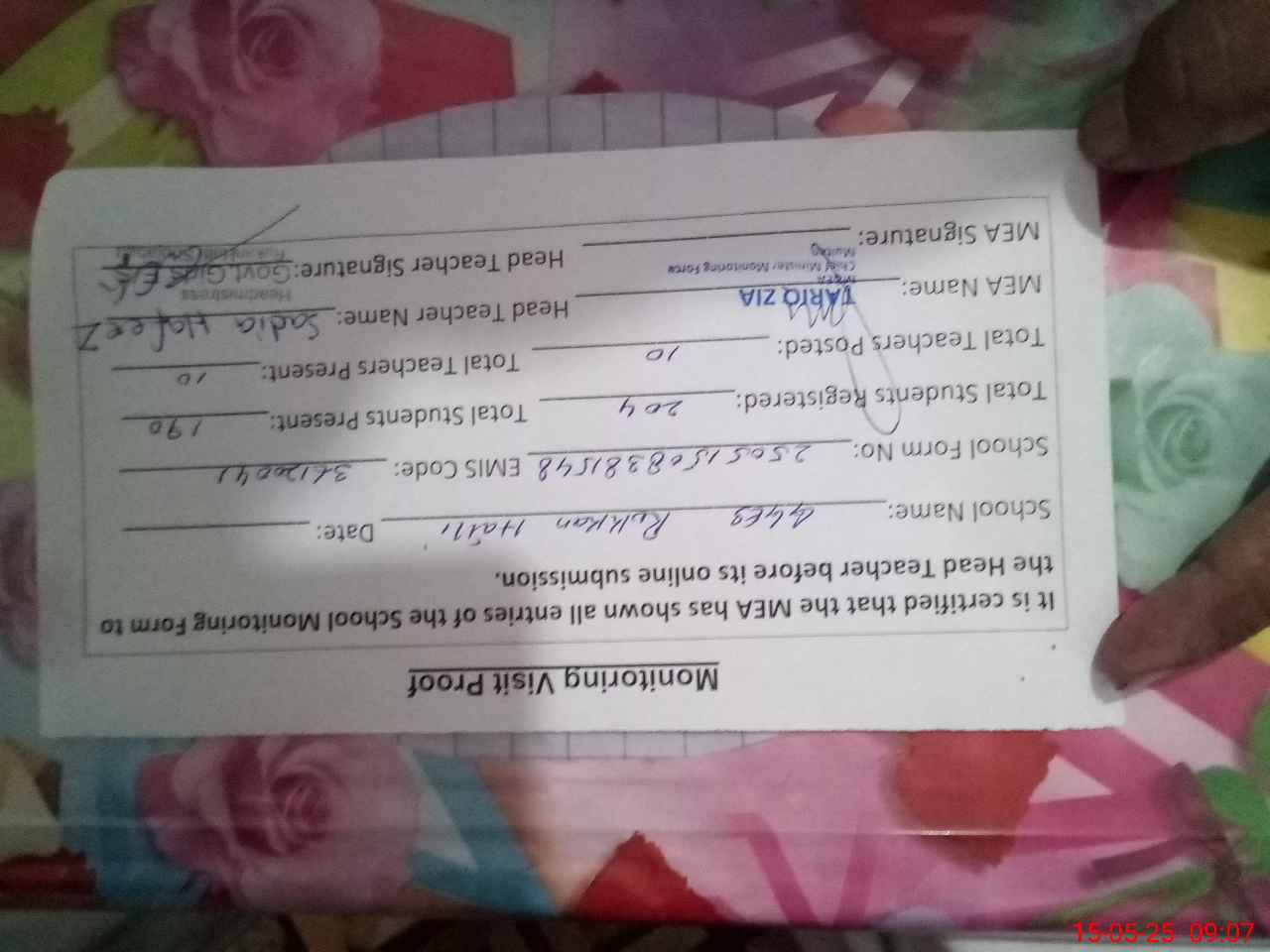 | Certified that this School was Inspected by the Undersigned MEA/DMO Today and the Information Stated Above is as Per Record. | |||||