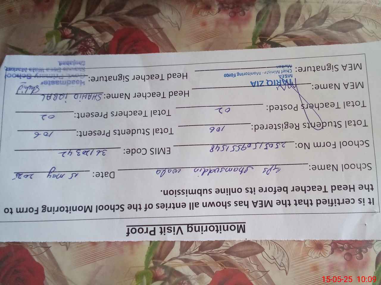 | Certified that this School was Inspected by the Undersigned MEA/DMO Today and the Information Stated Above is as Per Record. | |||||