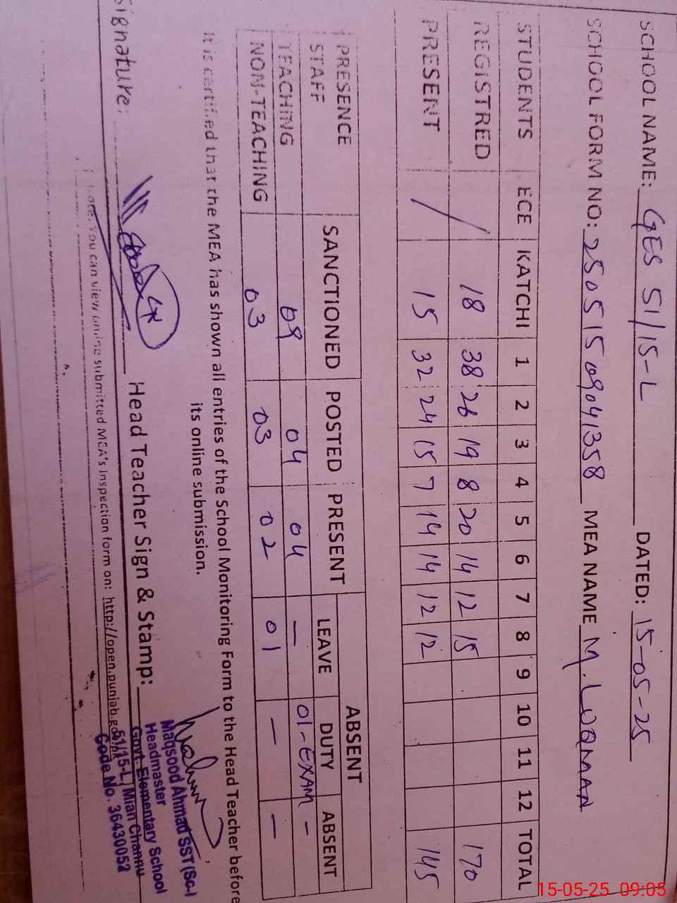 | Certified that this School was Inspected by the Undersigned MEA/DMO Today and the Information Stated Above is as Per Record. | |||||