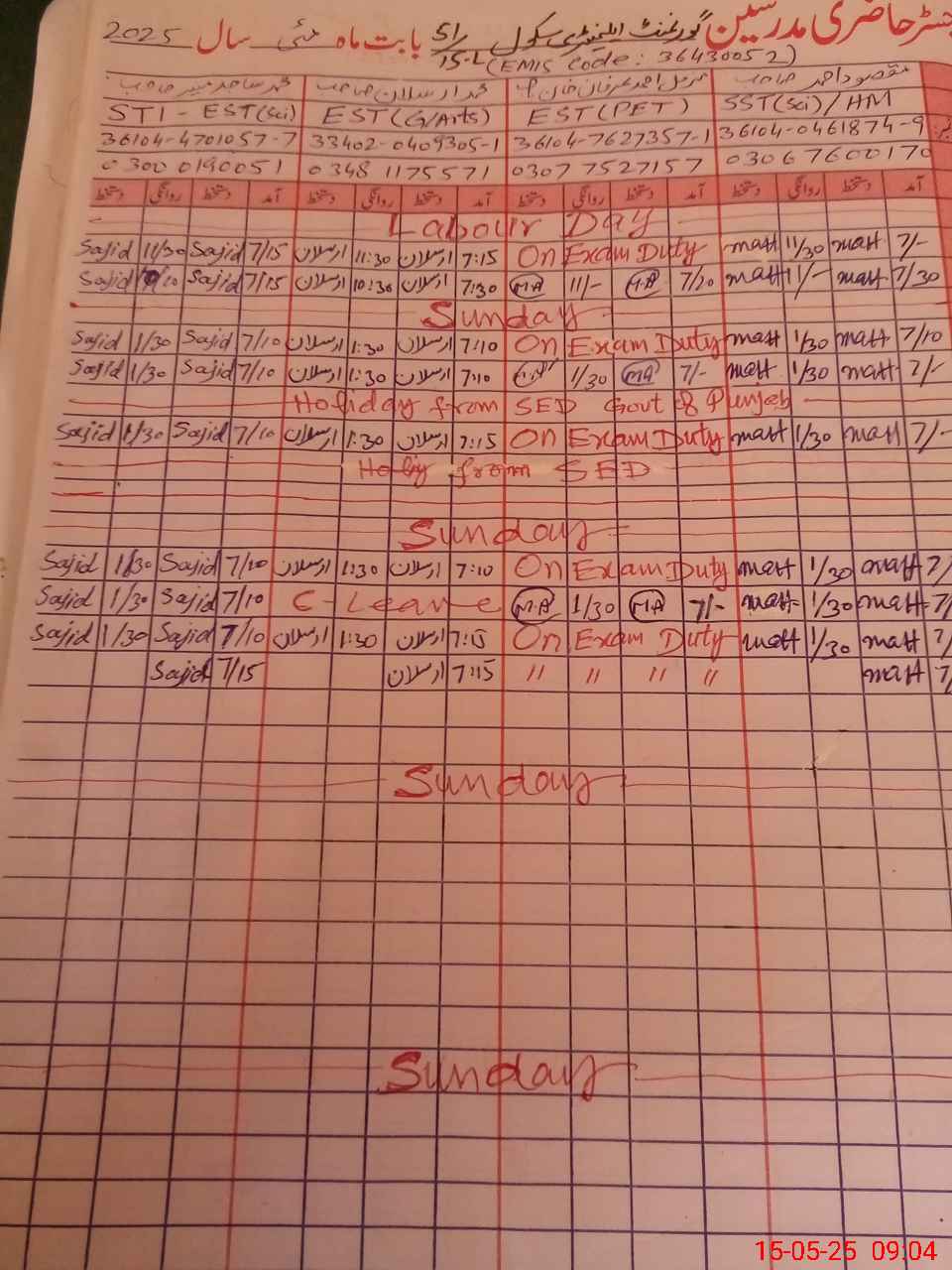 | 36**** | Mu**** Ah**** Ir**** Kh**** | EST | Regular | 0 | 0 | 0 | 0 | 0 | 0 | 0 | 0 | 0 | Exam Duty |