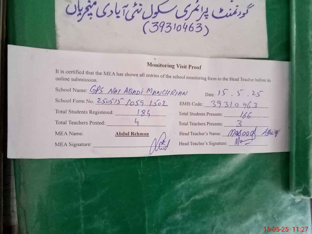 | EMIS Code: 39310463 | Name of School: GPS NAI ABADI MANCHRIAN | |||