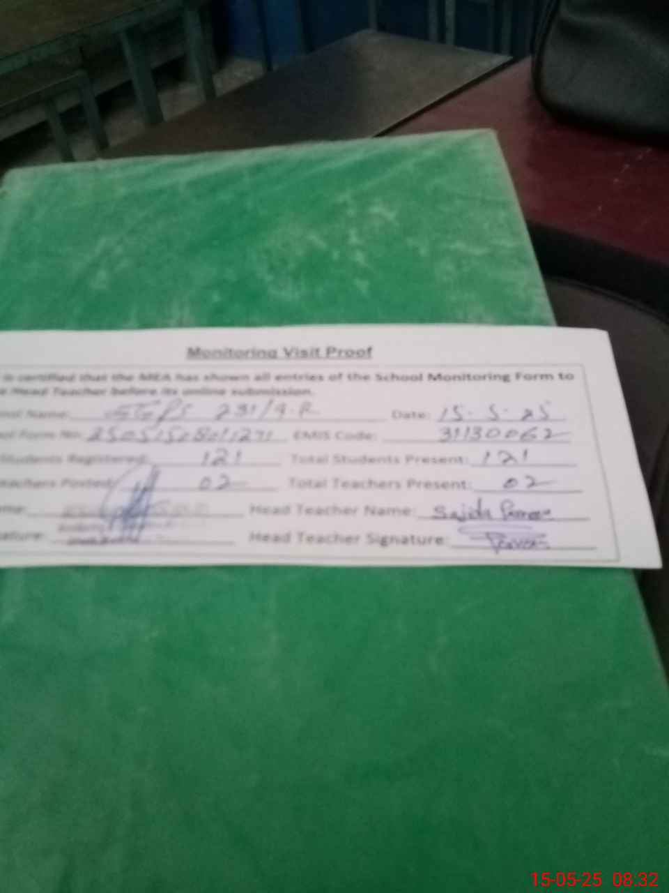| Attendance Register | Head Teacher | MEA with School | Visit Proof |