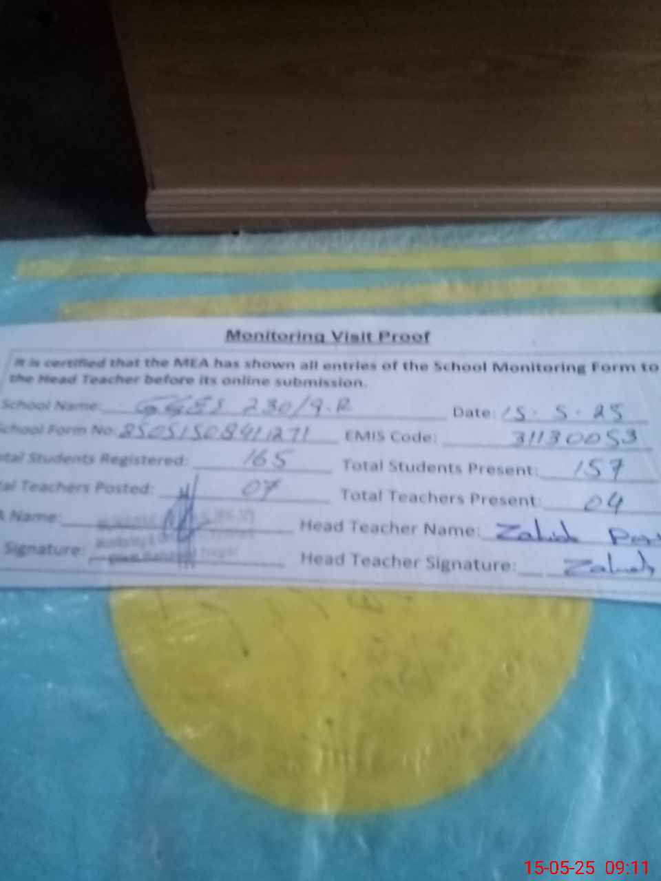 | Attendance Register | Head Teacher | MEA with School | Visit Proof |