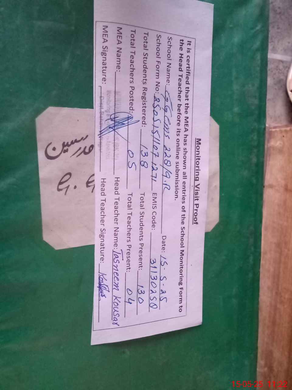 | Attendance Register | Head Teacher | MEA with School | Visit Proof |