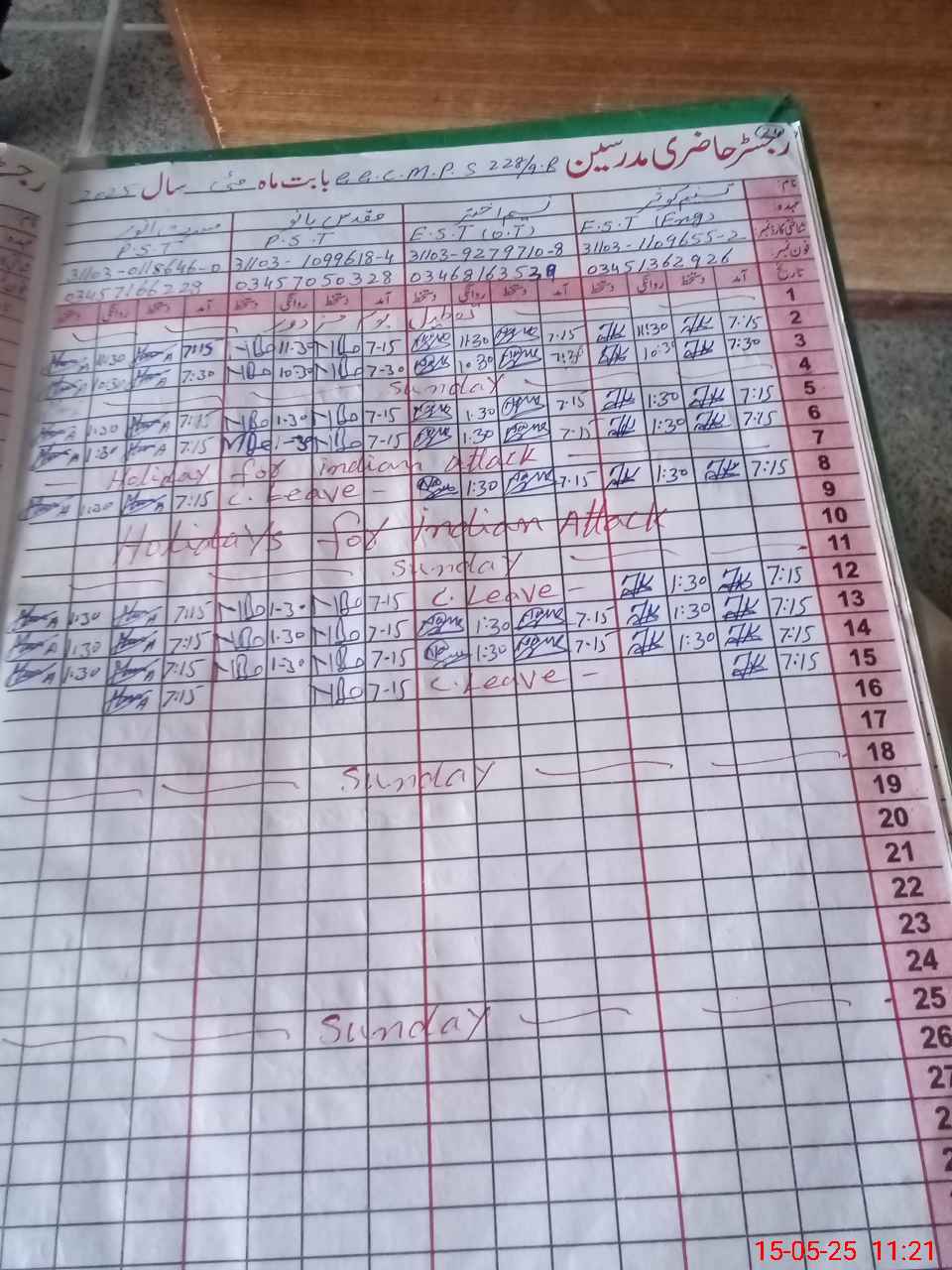 | CNIC | Full Name | Designation | R/C | Absence During Last Calender Month |
