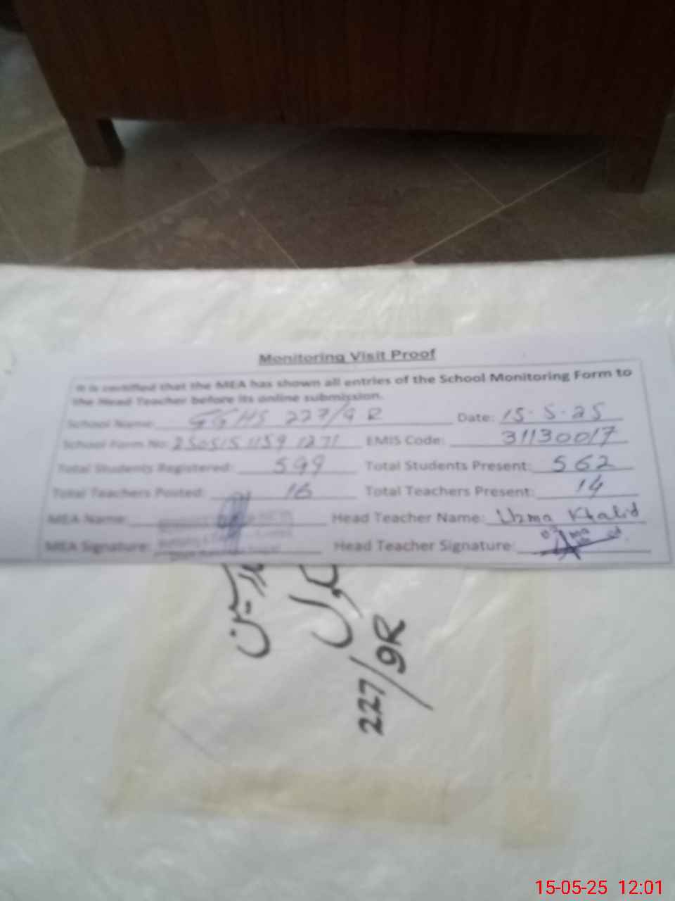| EMIS Code: 31130017 | Name of School: GGHS CHAK NO.227/9-R | |||