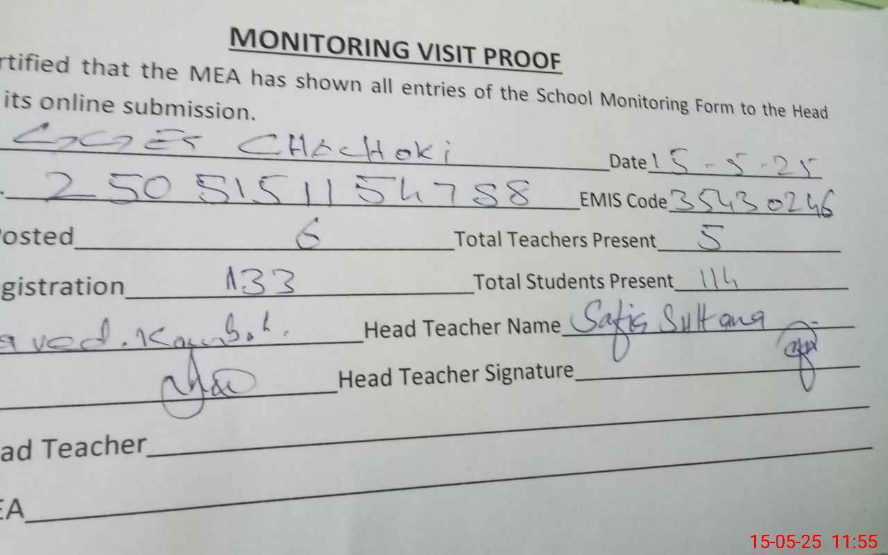 | Attendance Register | Head Teacher | MEA with School | Visit Proof |