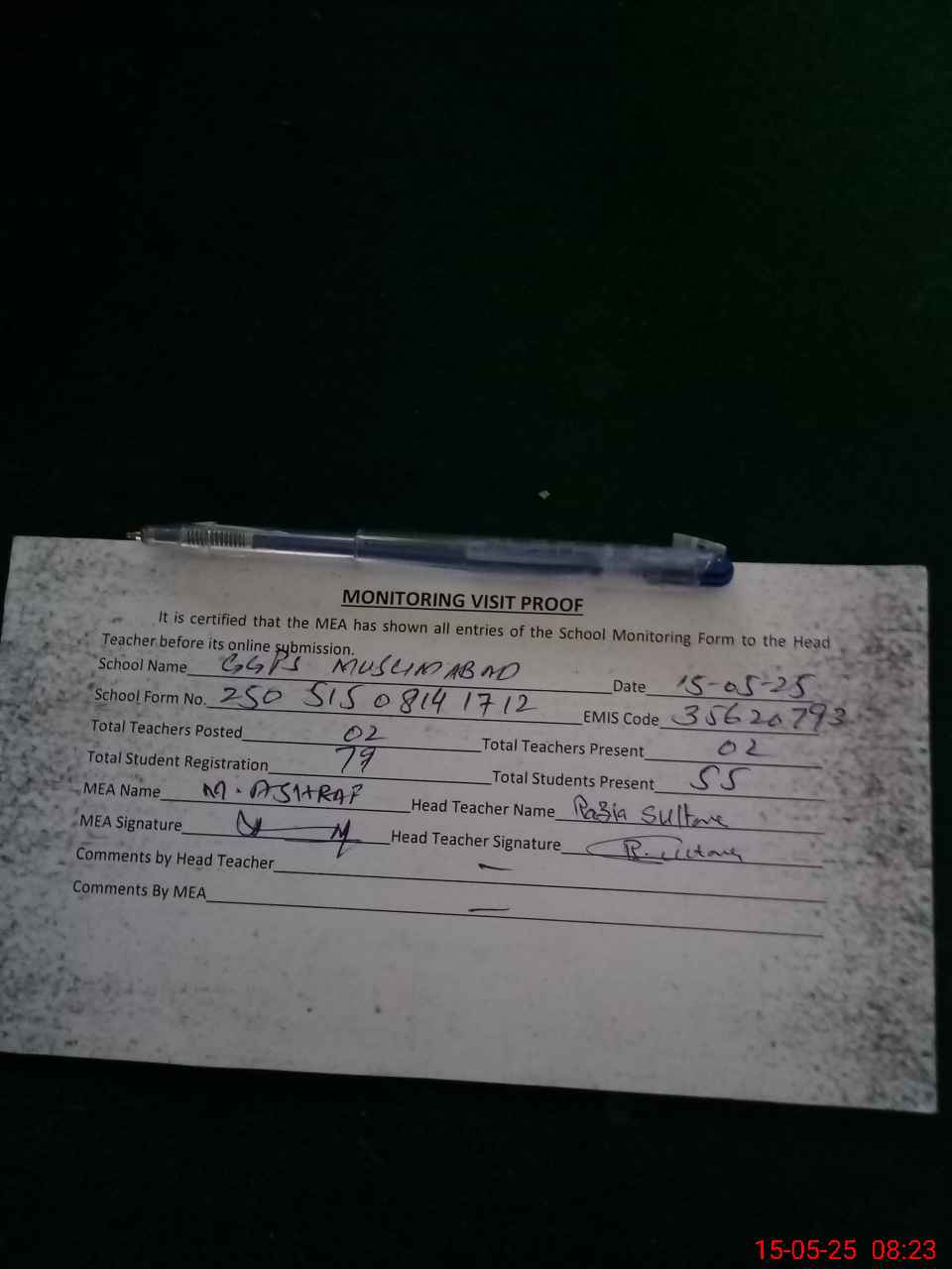| Attendance Register | Head Teacher | MEA with School | Visit Proof |