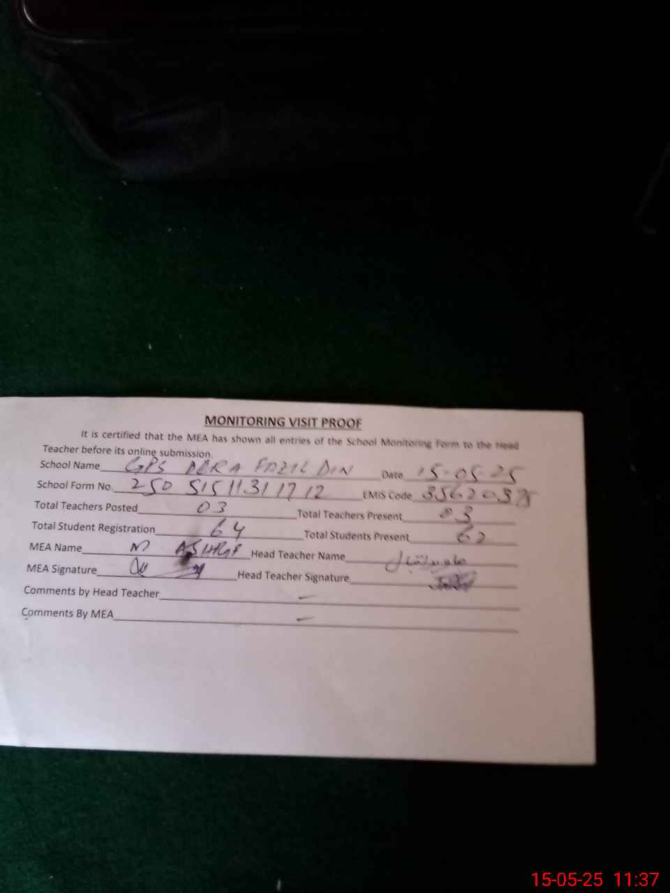 | Attendance Register | Head Teacher | MEA with School | Visit Proof |
