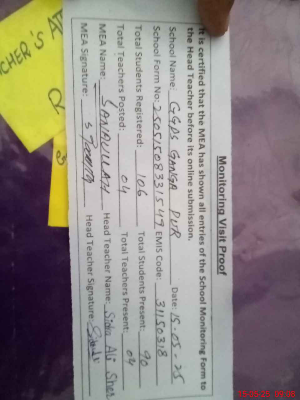 | Attendance Register | Head Teacher | MEA with School | Visit Proof |