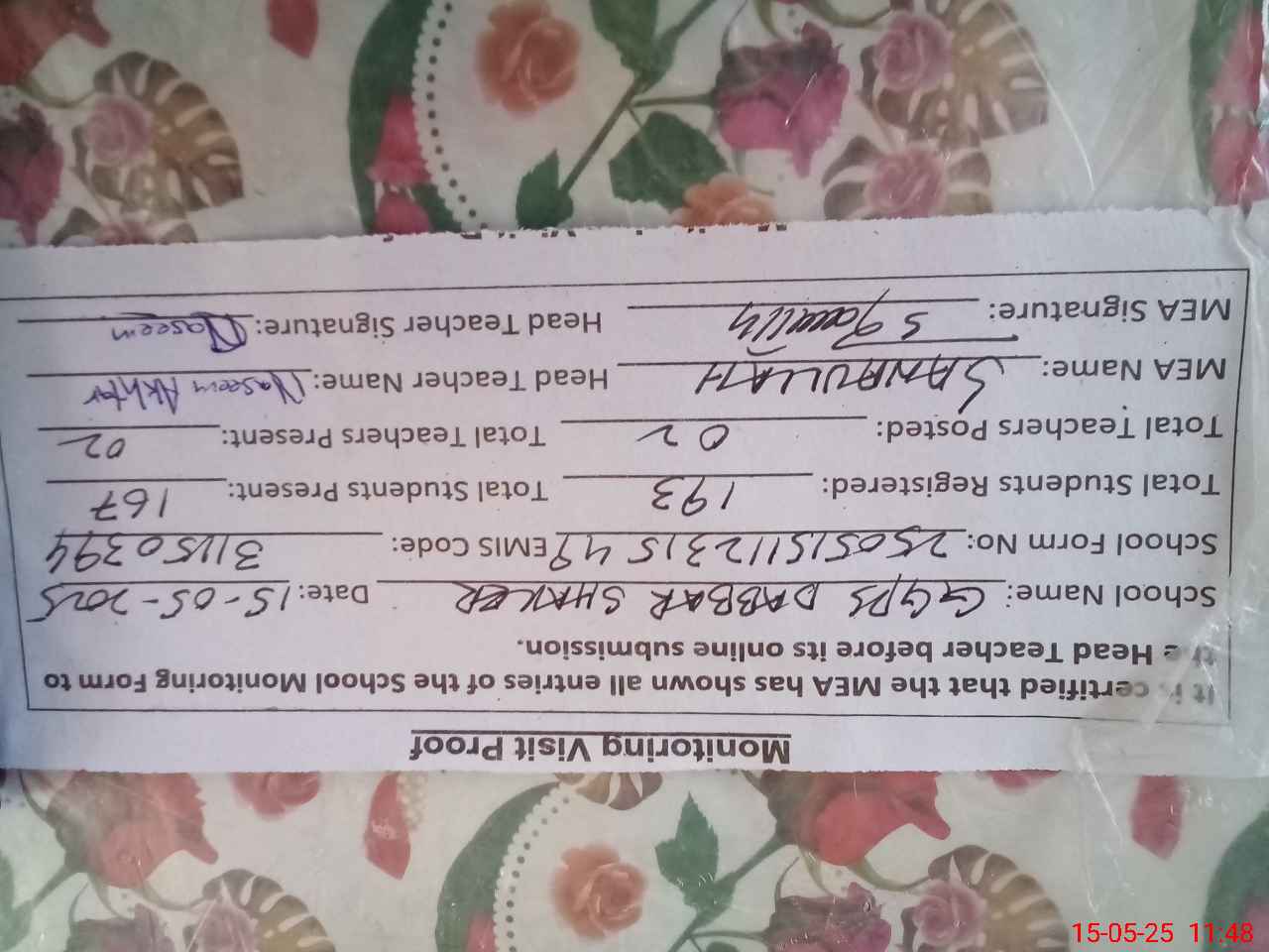 | Certified that this School was Inspected by the Undersigned MEA/DMO Today and the Information Stated Above is as Per Record. | |||||