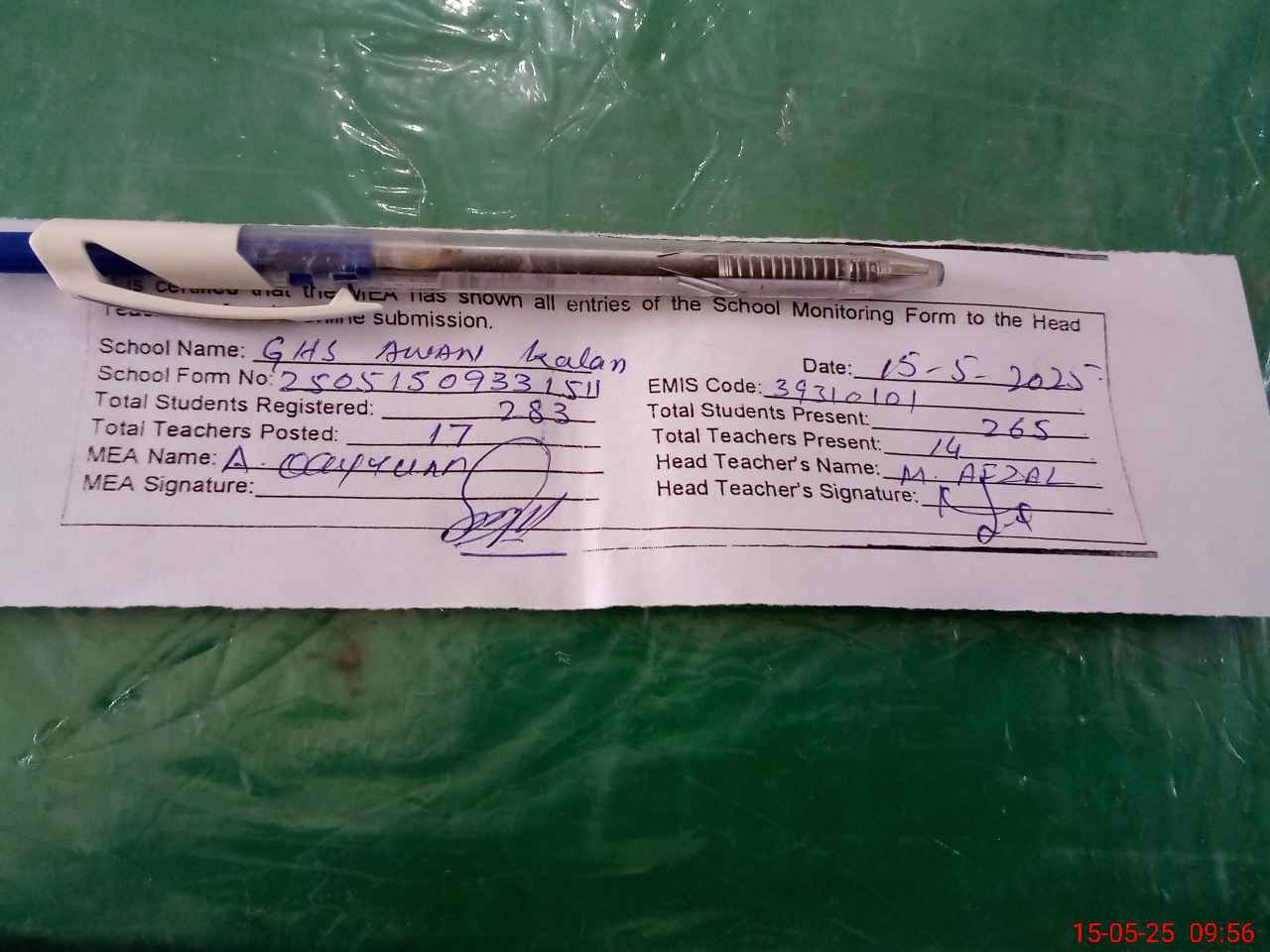 | Attendance Register | Head Teacher | MEA with School | Visit Proof |