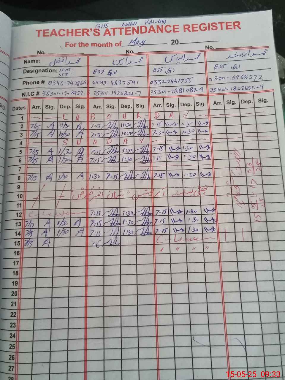 | CNIC | Full Name | Designation | R/C | Absence During Last Calender Month |