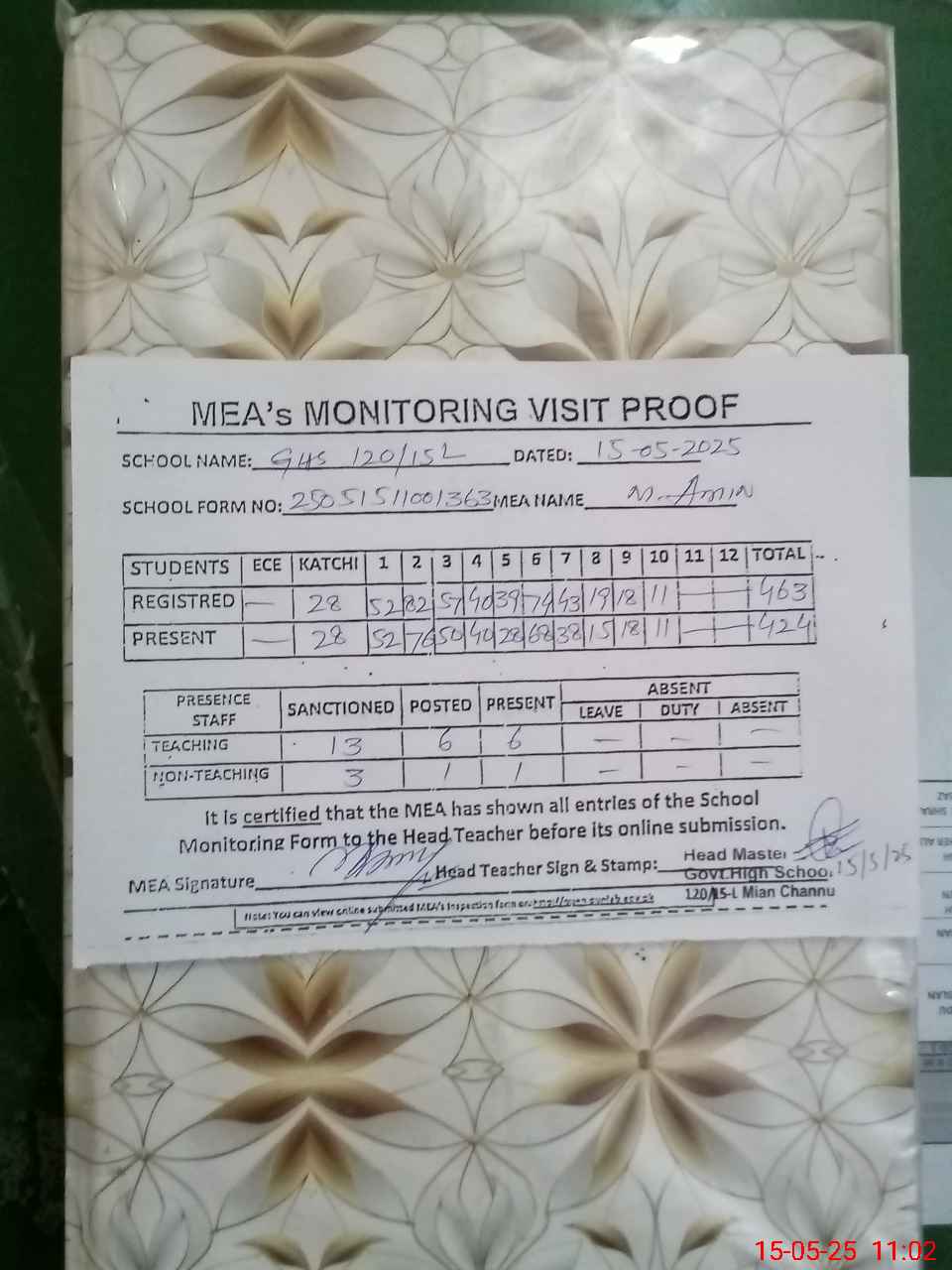 | EMIS Code: 36430211 | Name of School: GHS 120/15-L, MIAN CHANNU | |||