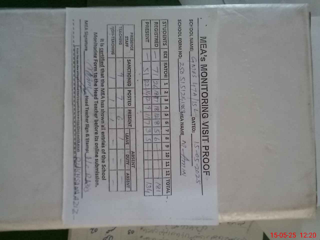 | Attendance Register | Head Teacher | MEA with School | Visit Proof |
