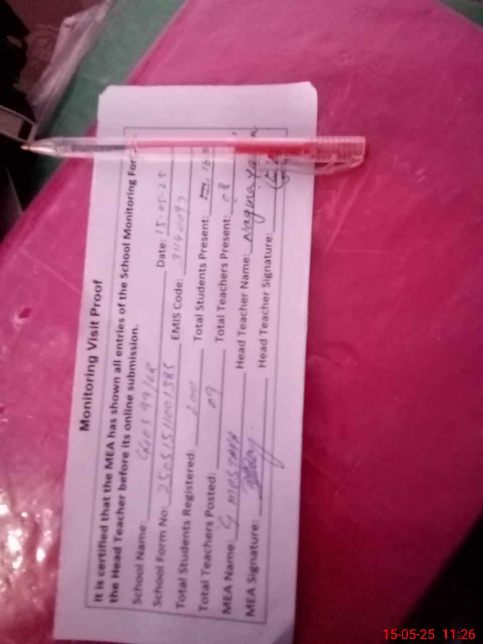 | Attendance Register | Head Teacher | MEA with School | Visit Proof |