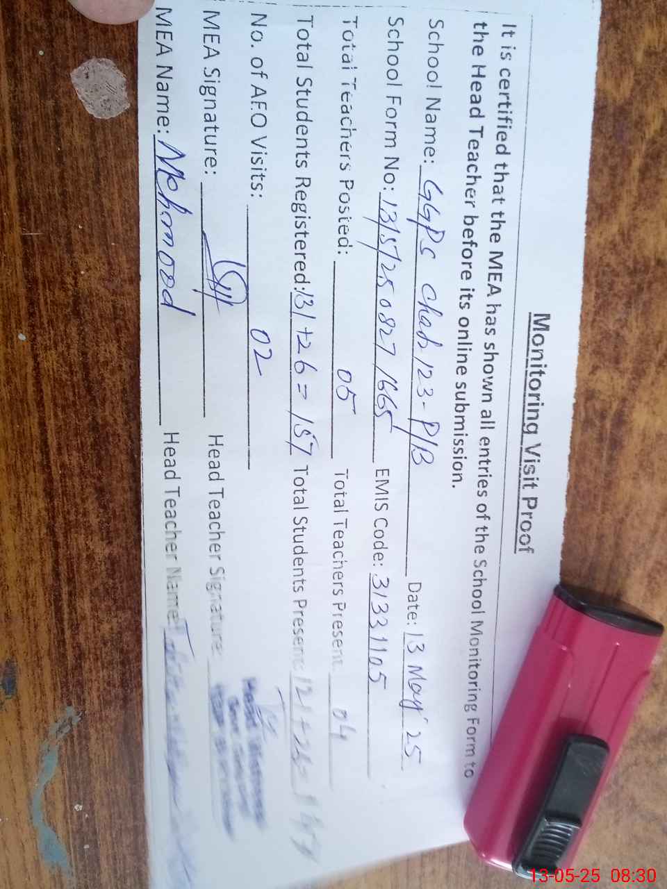 | Attendance Register | Head Teacher | MEA with School | Visit Proof |