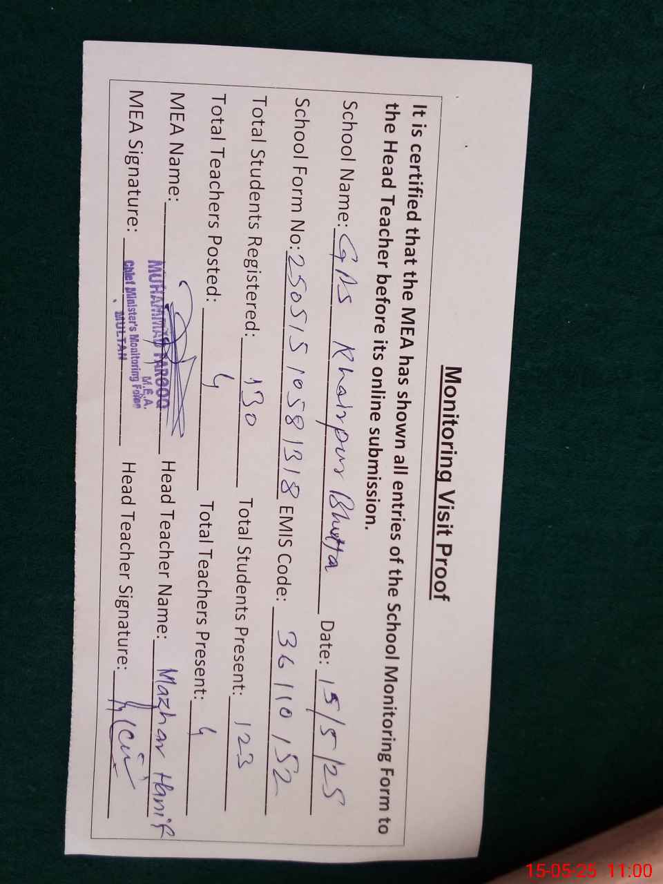 | Attendance Register | Head Teacher | MEA with School | Visit Proof |