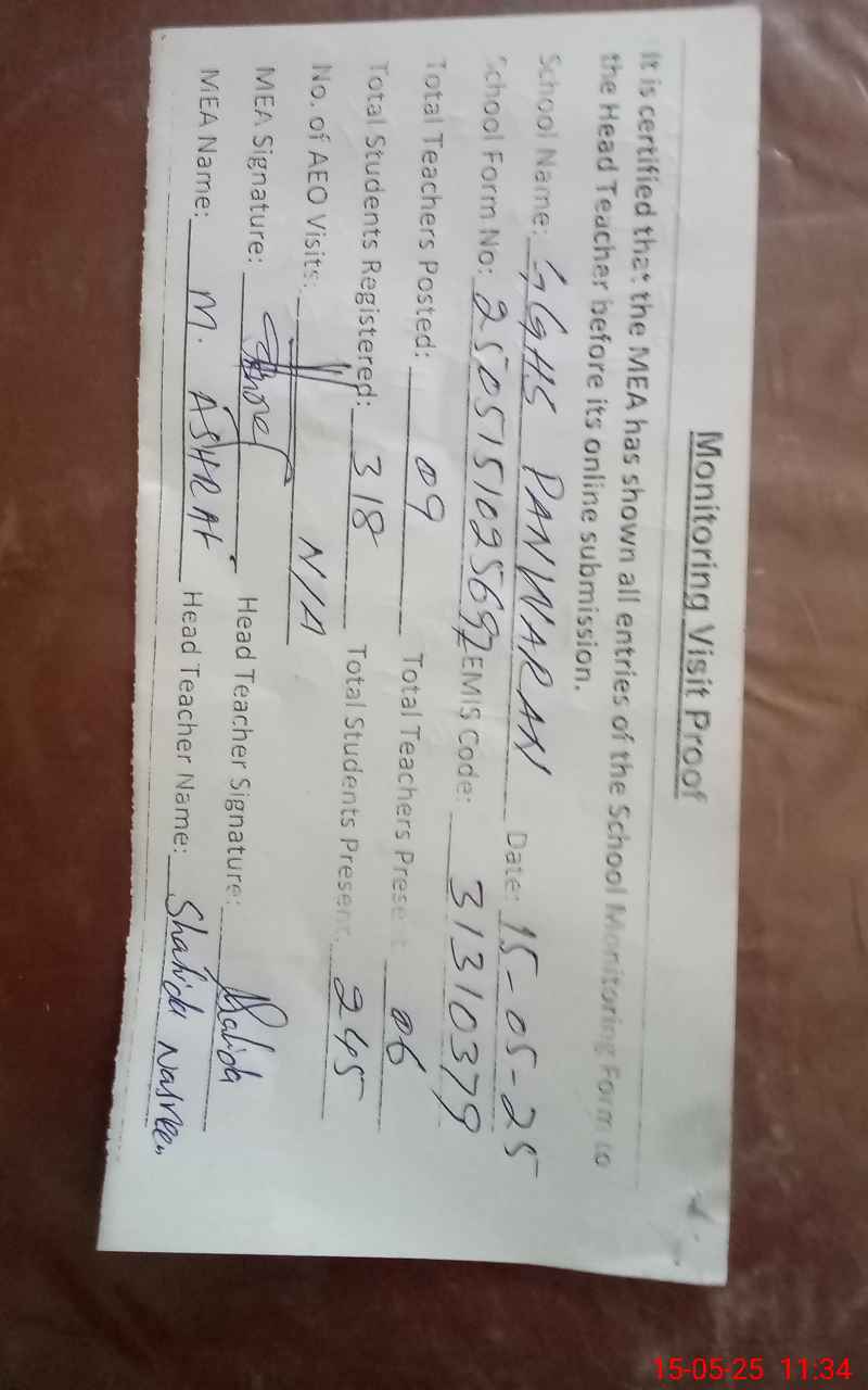 | Attendance Register | Head Teacher | MEA with School | Visit Proof |