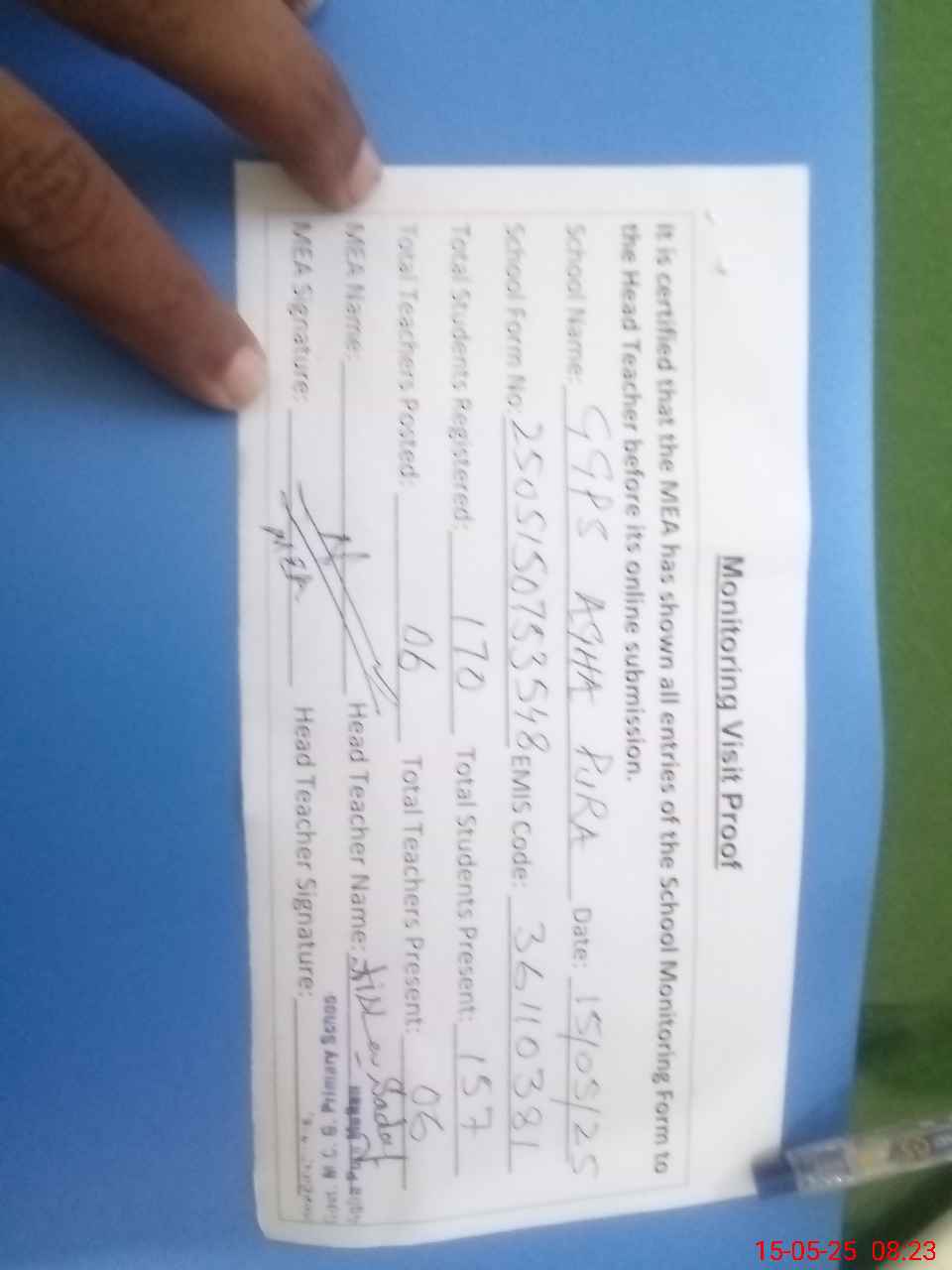 | Attendance Register | Head Teacher | MEA with School | Visit Proof |