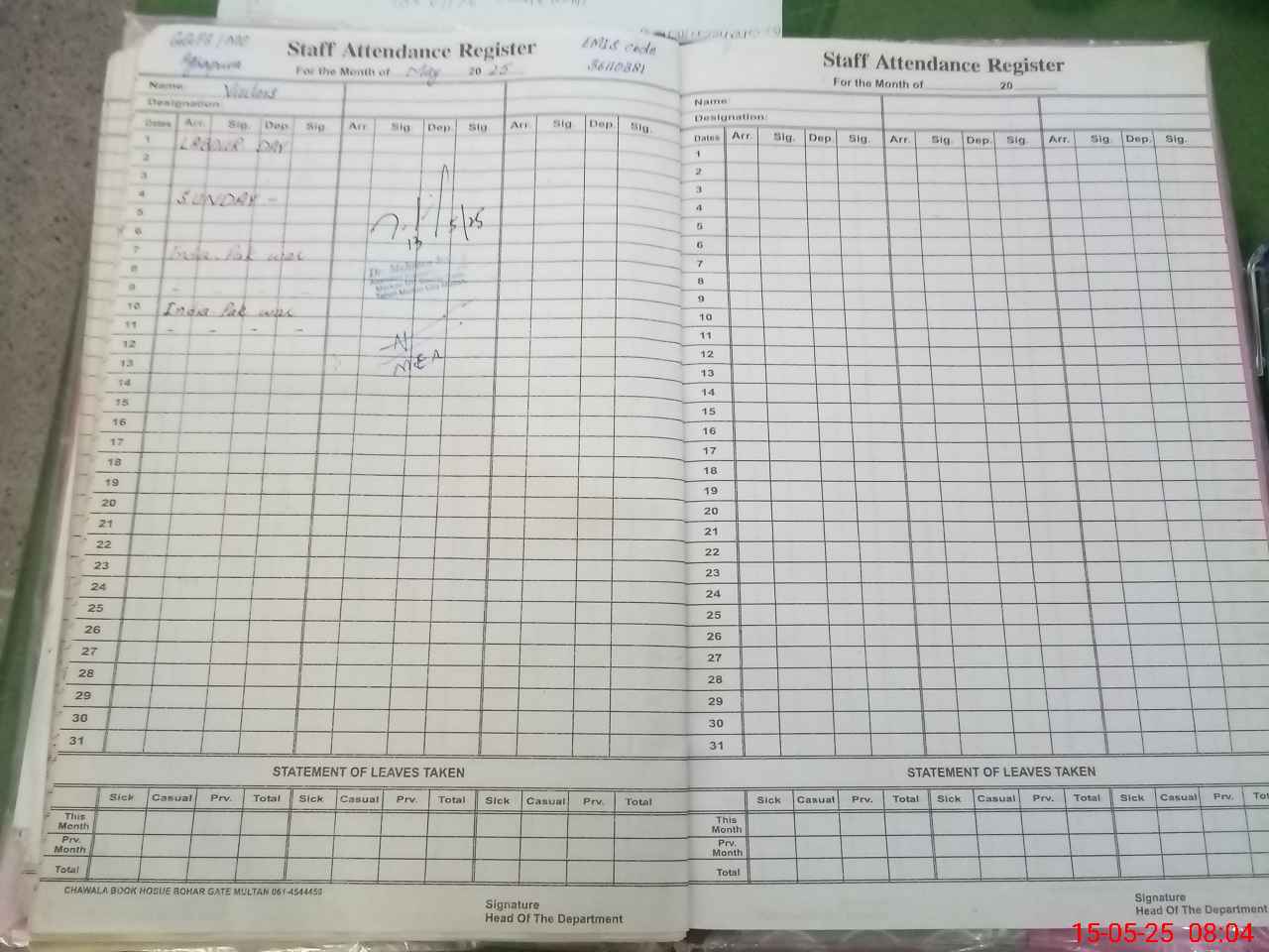 | Leave | Duty | Absent | Maternity | Medical | Ex- Pak |