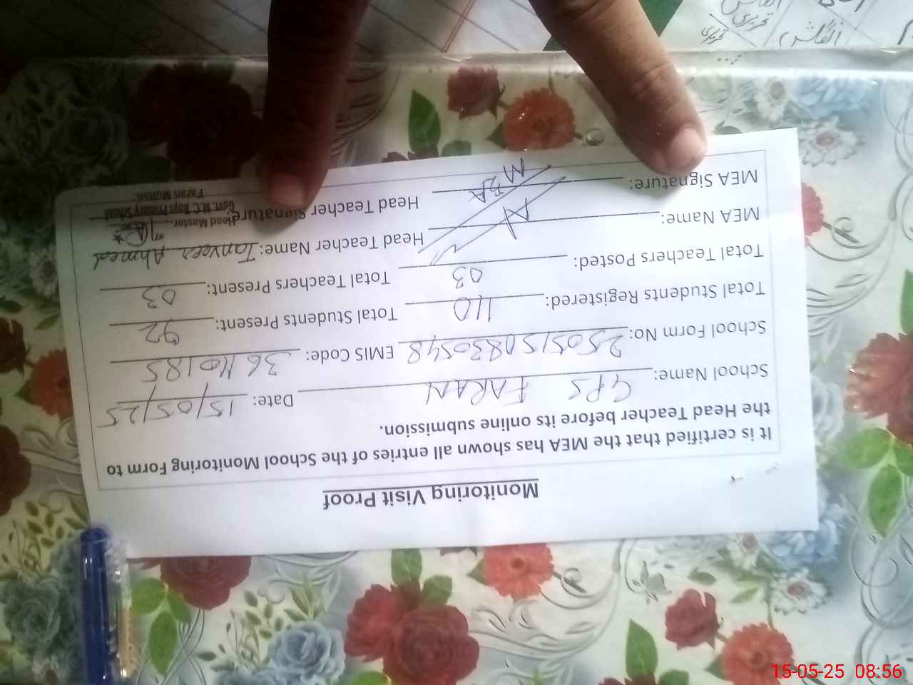 | Attendance Register | Head Teacher | MEA with School | Visit Proof |