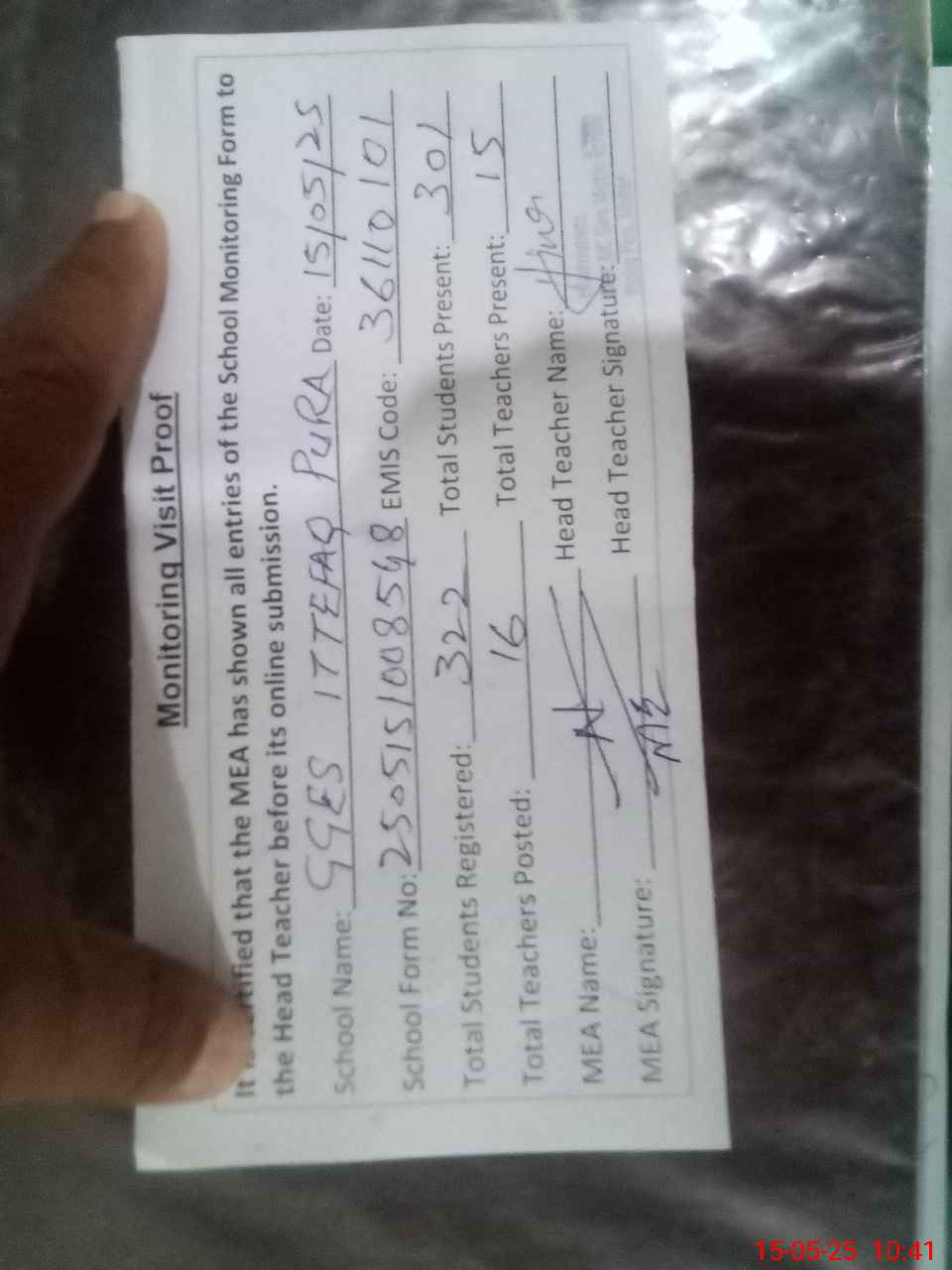 | Attendance Register | Head Teacher | MEA with School | Visit Proof |