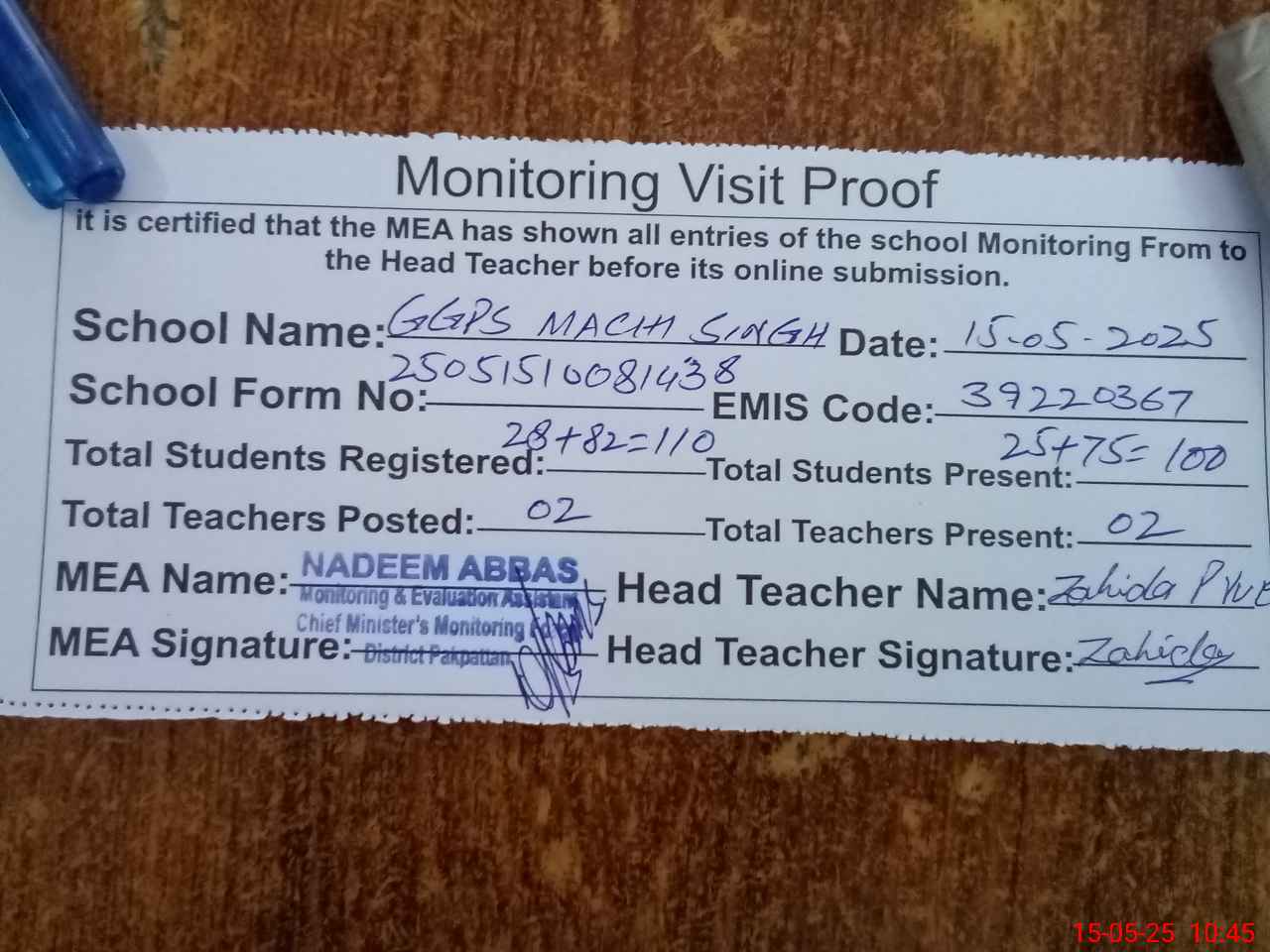 | Attendance Register | Head Teacher | MEA with School | Visit Proof |