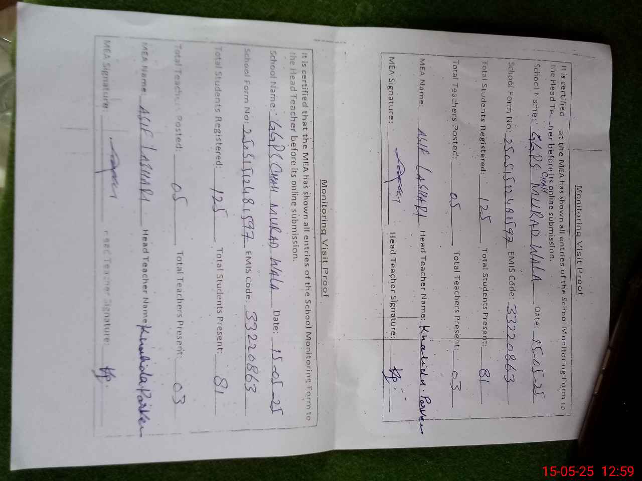 | Attendance Register | Head Teacher | MEA with School | Visit Proof |