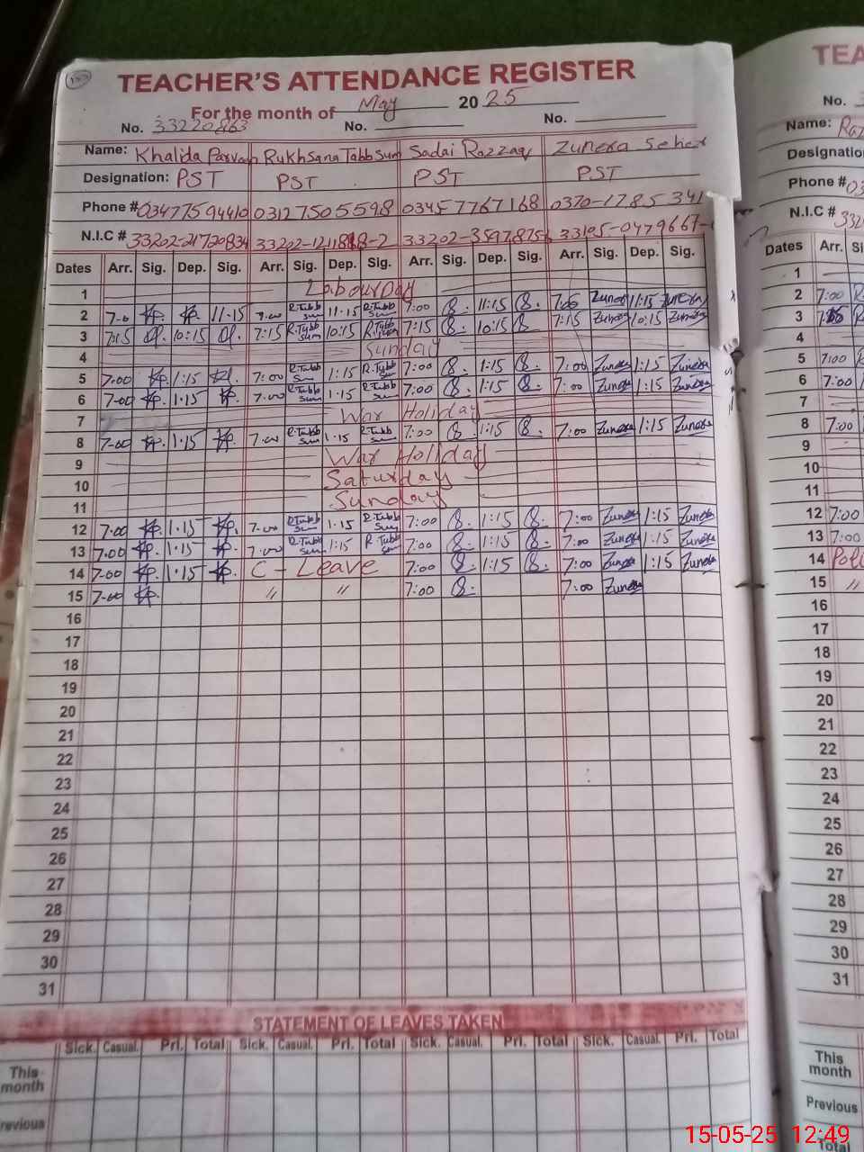 | CNIC | Full Name | Designation | R/C | Absence During Last Calender Month |