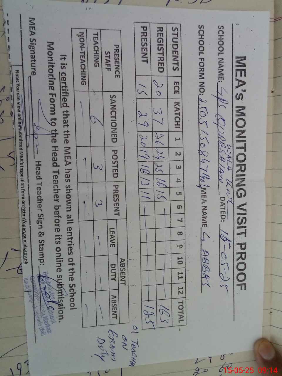 | Attendance Register | Head Teacher | MEA with School | Visit Proof |