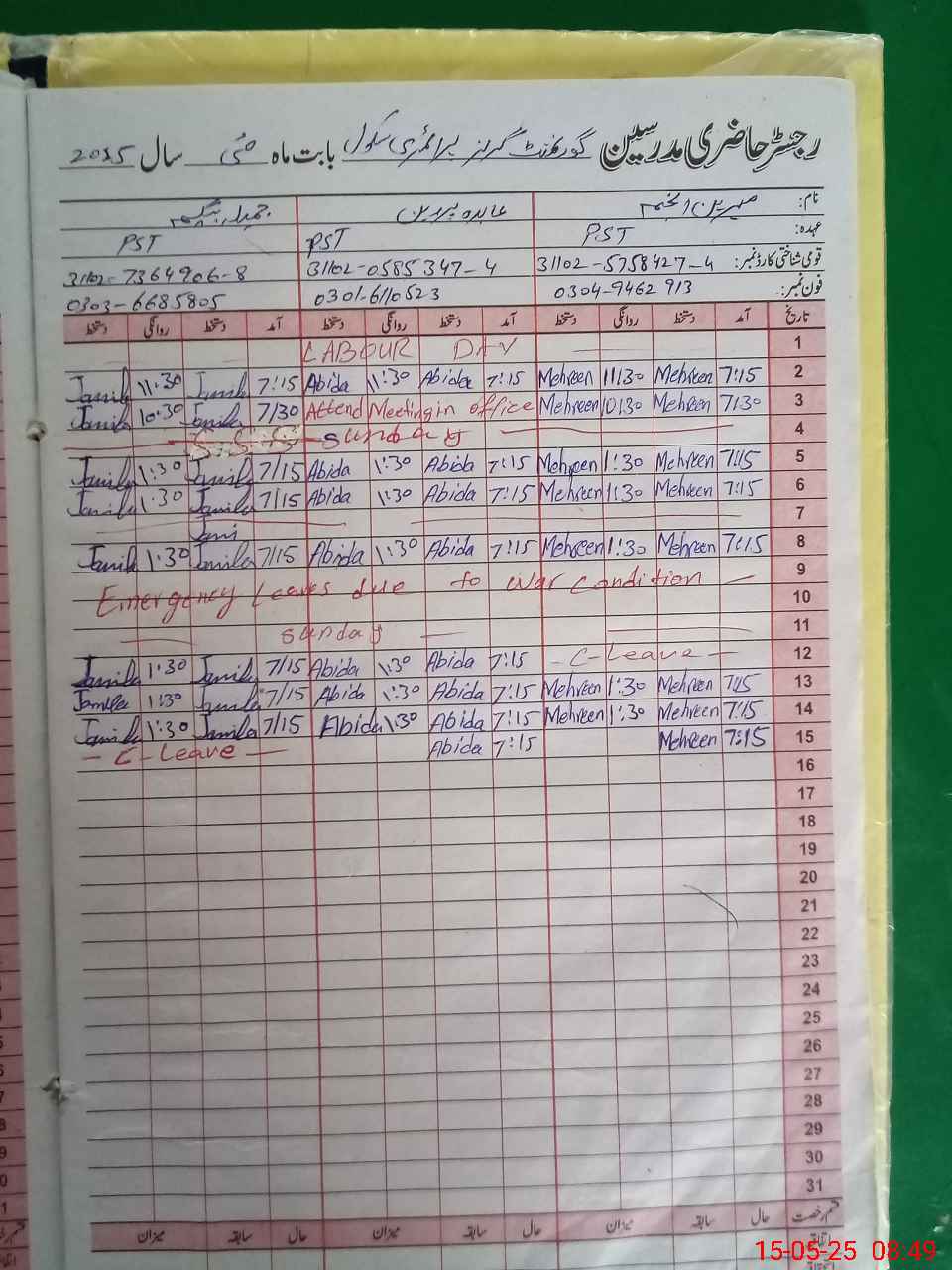 | CNIC | Full Name | Designation | R/C | Absence During Last Calender Month |