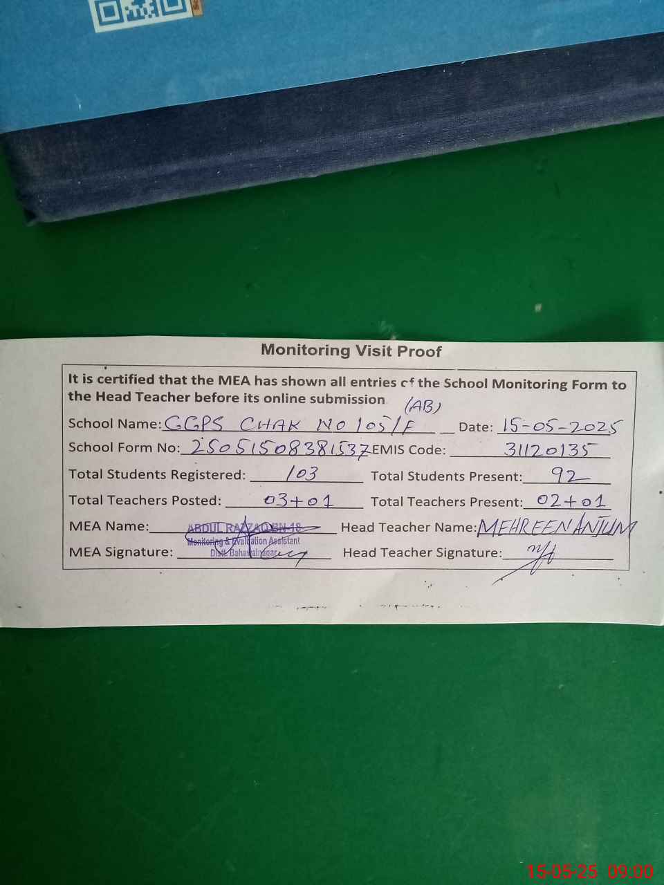 | Attendance Register | Head Teacher | MEA with School | Visit Proof |