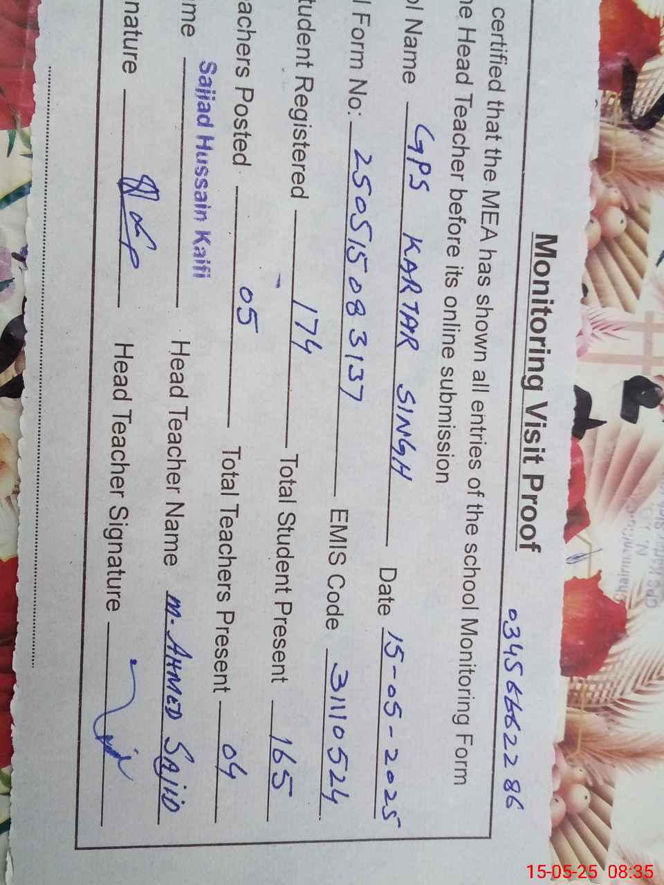 | EMIS Code: 31110524 | Name of School: GPS KARTAR SINGH | |||