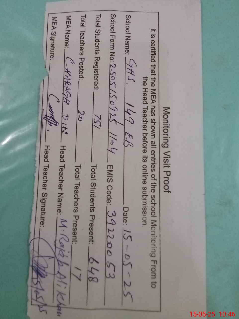 | EMIS Code: 39220053 | Name of School: GHS 149 EB ARIF WALA | |||