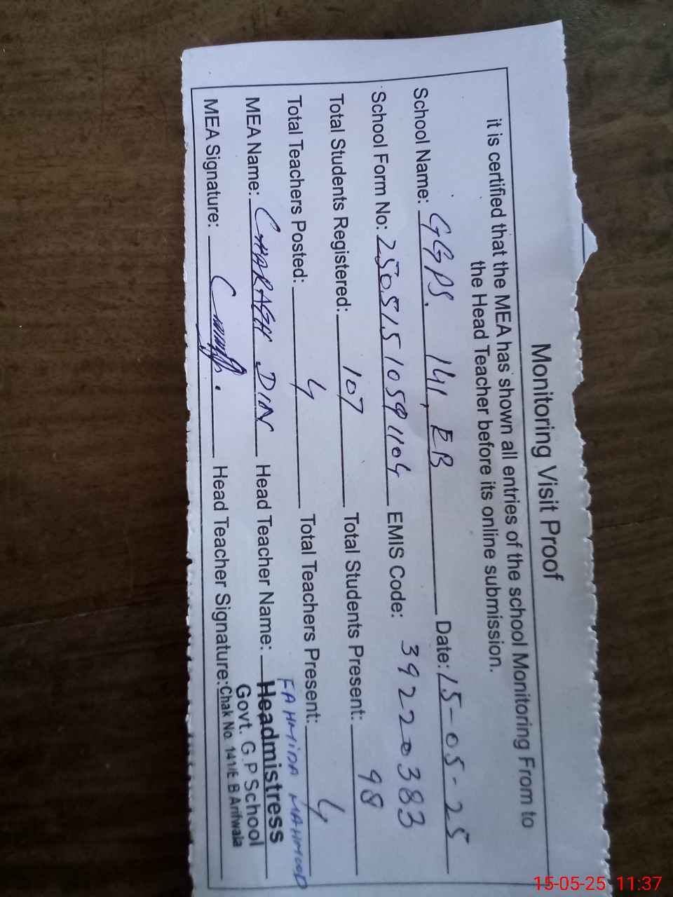 | EMIS Code: 39220383 | Name of School: GGPS 141 EB TEH ARIFWALA | |||