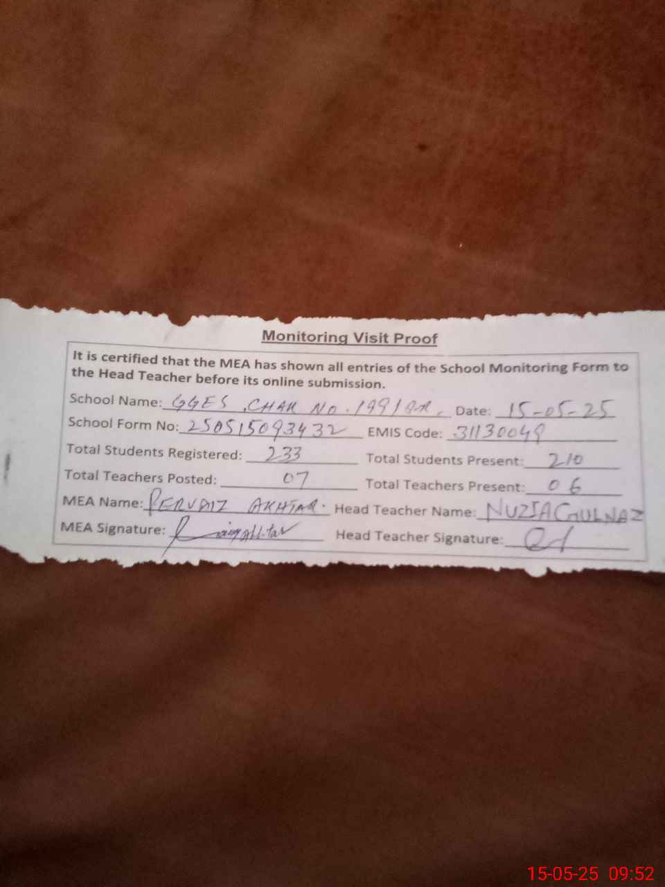 | Attendance Register | Head Teacher | MEA with School | Visit Proof |