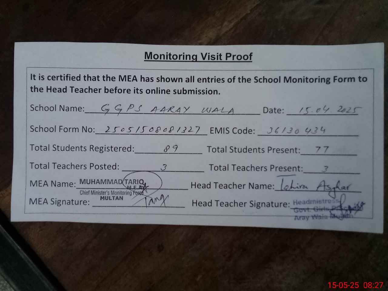 | EMIS Code: 36130434 | Name of School: GGPS AARAY WALA MUZA JHOK LASHAKAR PUR | |||