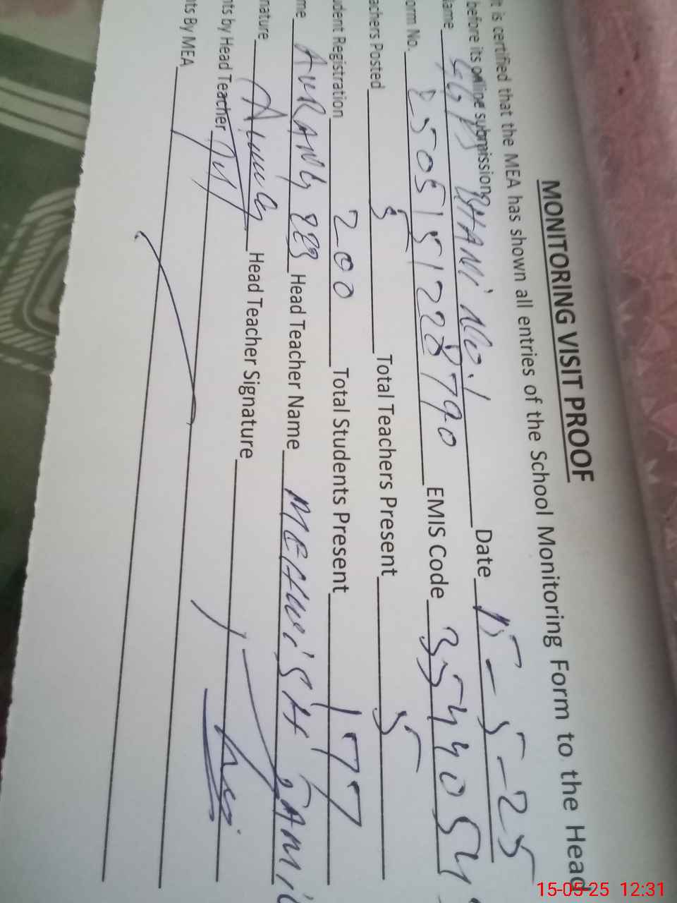 | Attendance Register | Head Teacher | MEA with School | Visit Proof |