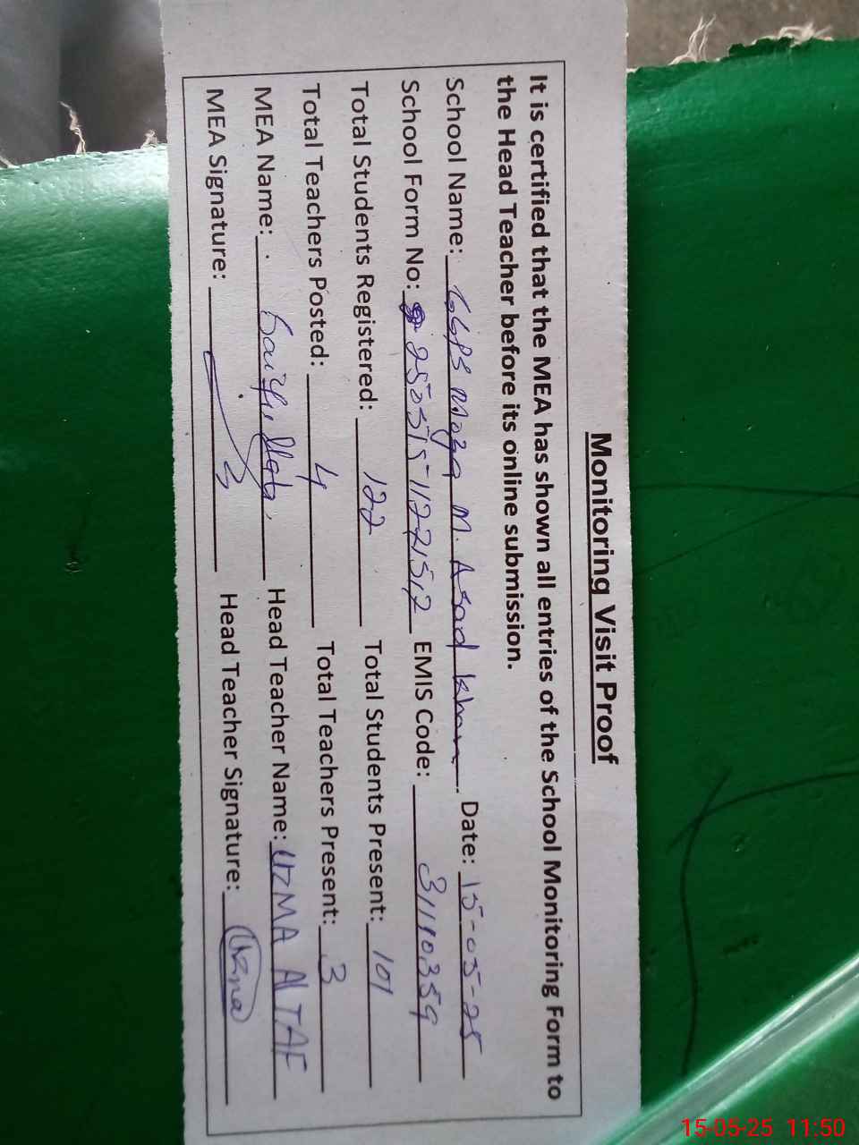 | Attendance Register | Head Teacher | MEA with School | Visit Proof |