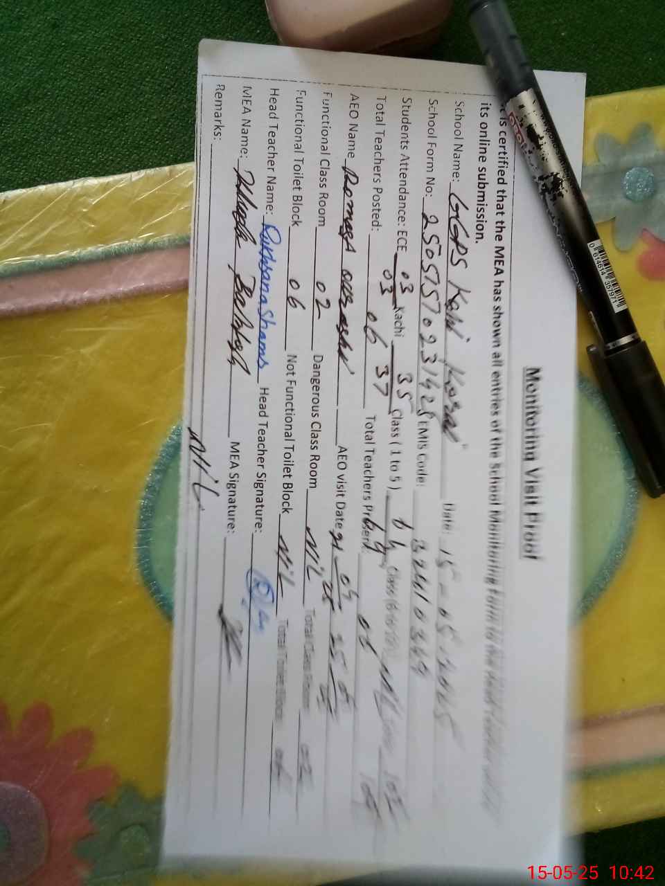 | Attendance Register | Head Teacher | MEA with School | Visit Proof |