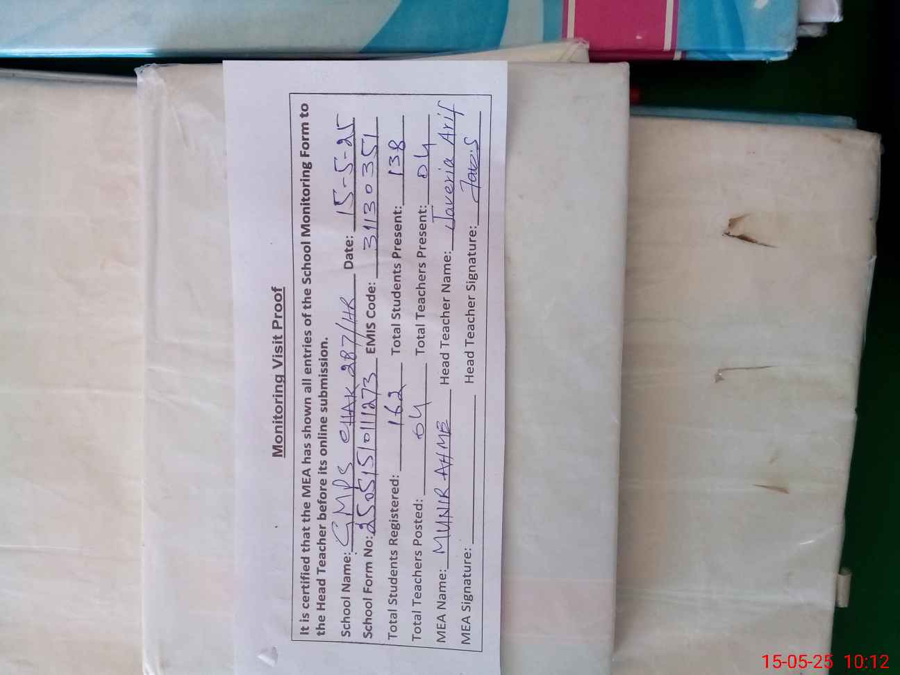 | Attendance Register | Head Teacher | MEA with School | Visit Proof |