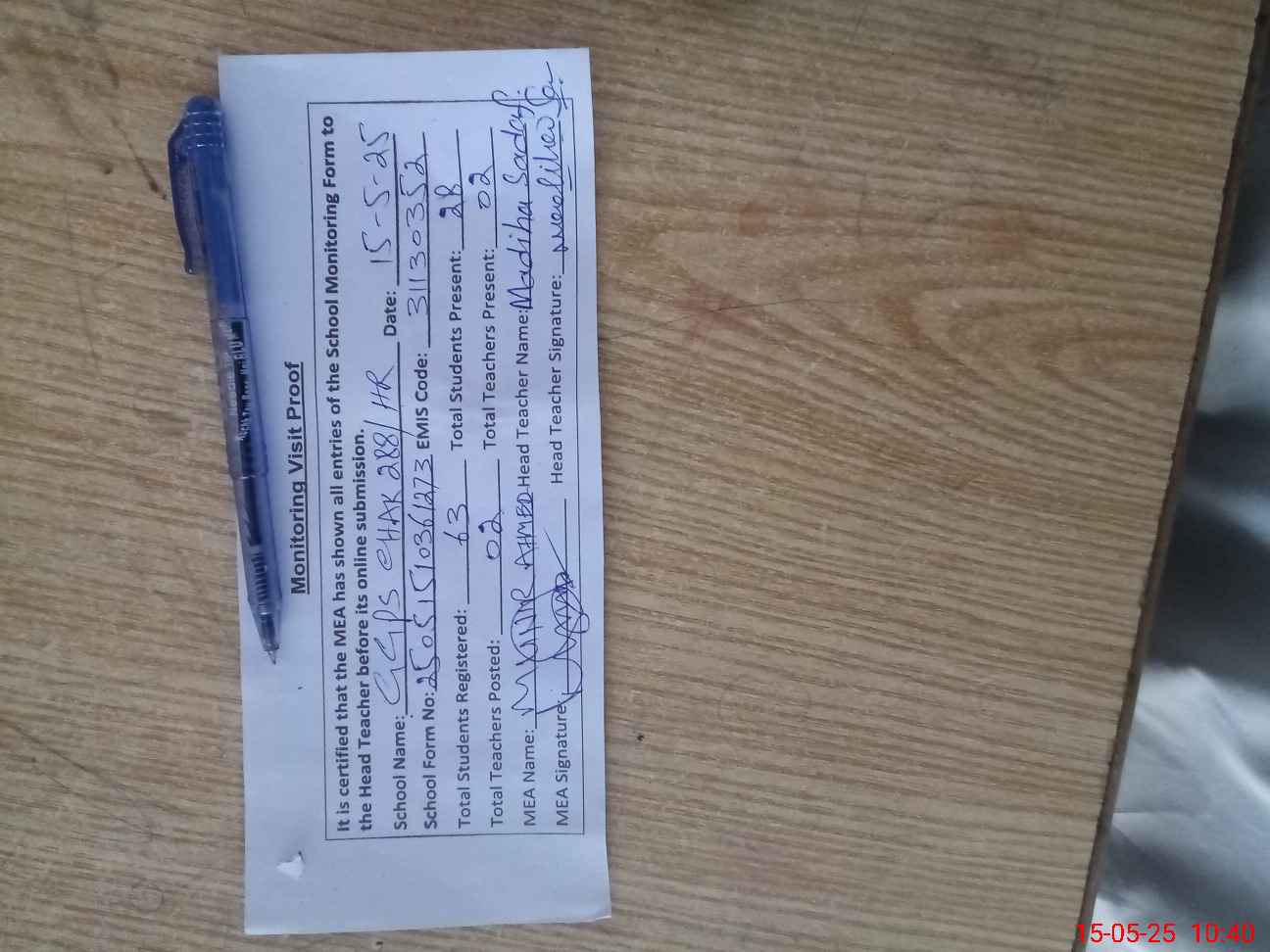 | Attendance Register | Head Teacher | MEA with School | Visit Proof |