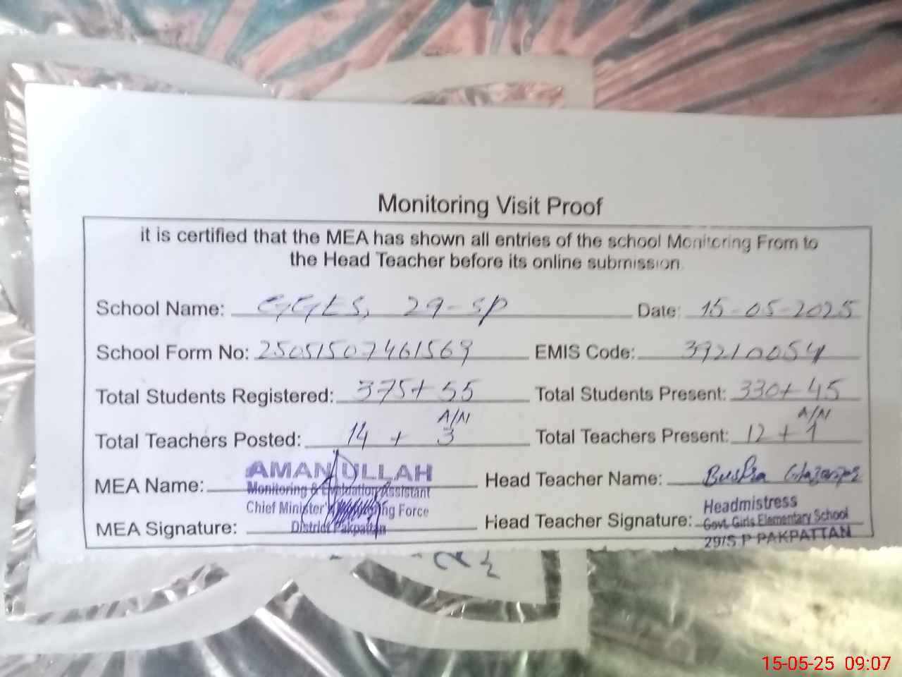 | EMIS Code: 39210054 | Name of School: GGES 29 SP | |||