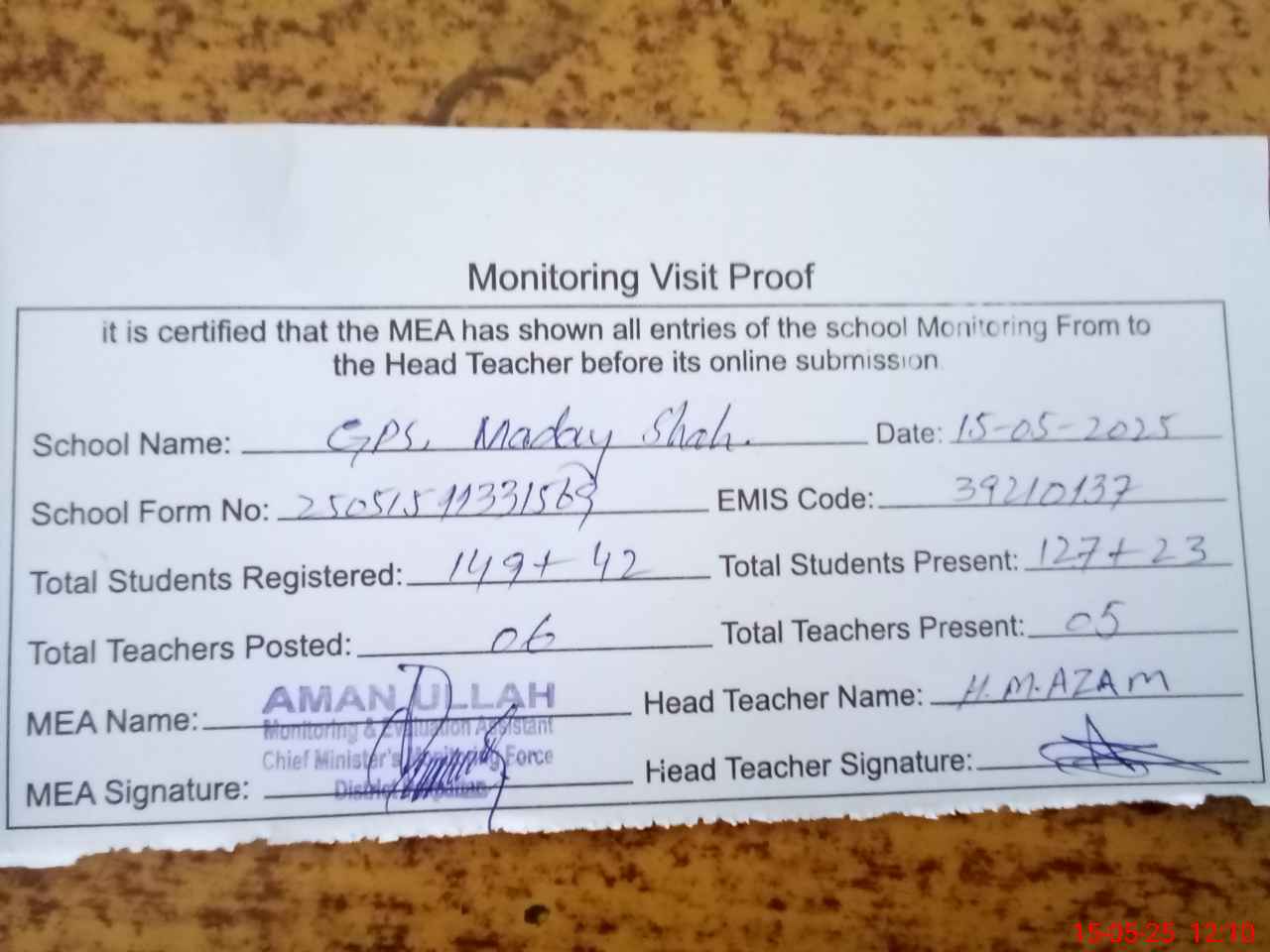 | Attendance Register | Head Teacher | MEA with School | Visit Proof |