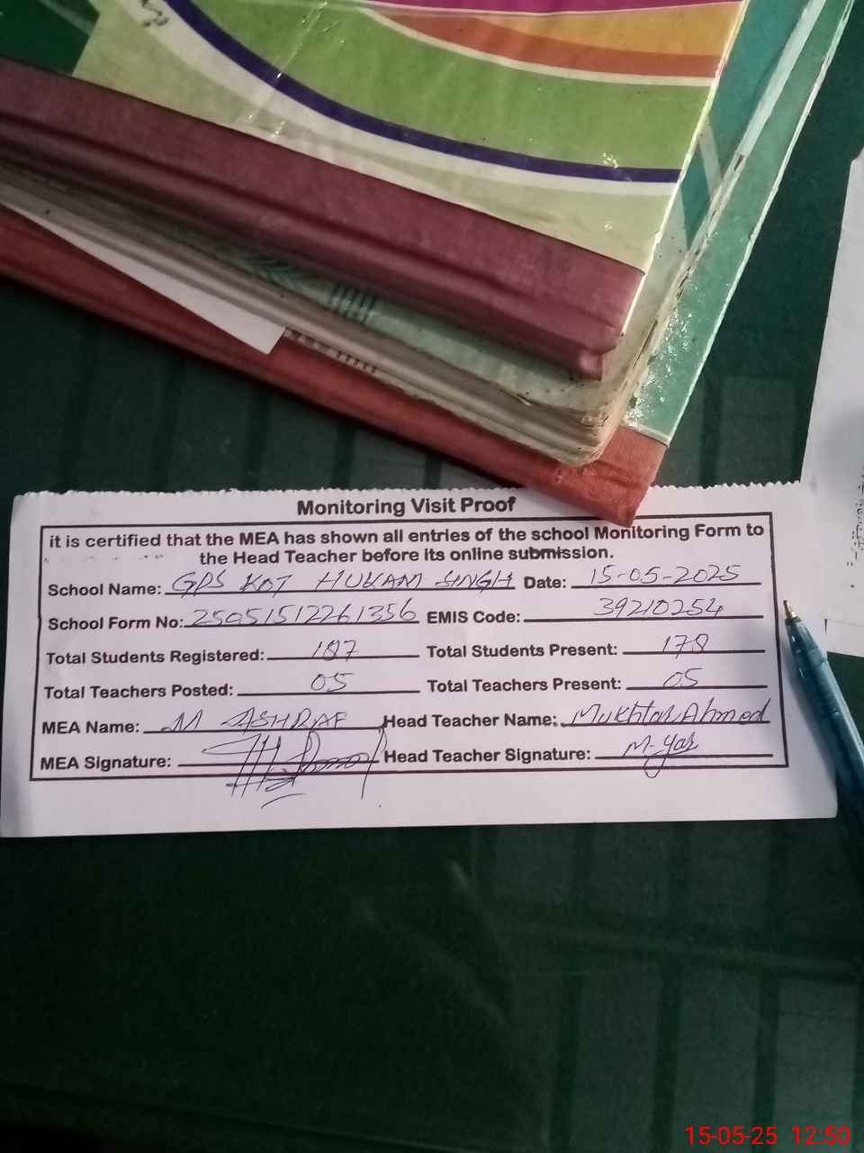 | Attendance Register | Head Teacher | MEA with School | Visit Proof |
