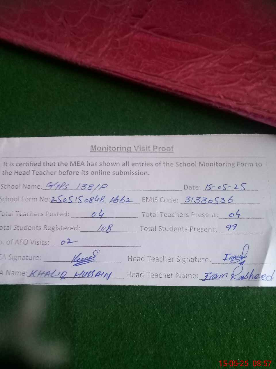 | Attendance Register | Head Teacher | MEA with School | Visit Proof |