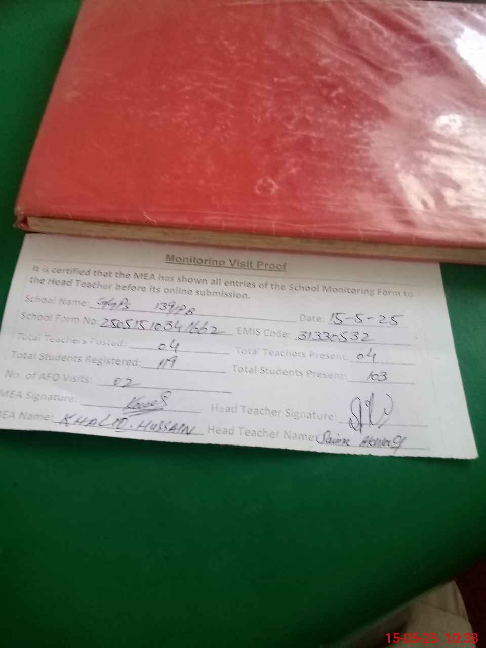 | Attendance Register | Head Teacher | MEA with School | Visit Proof |